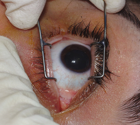 ocular preparation (Fig. 18), using a lid speculum (Fig. 19), and avoiding needle contact with the lid margins and lashes (Fig. 20).