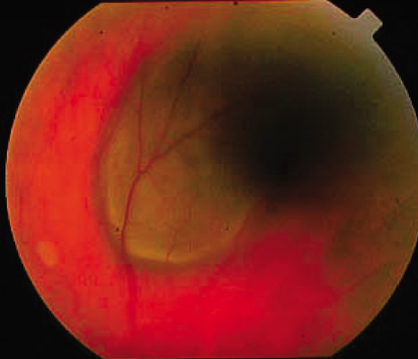 Another method of radiotherapy is charged particle irradiation.39–42 This technique provides a focused beam of radiotherapy to the region of the tumor from an external source. A recent report showed that the 5- and 10-year rates of regrowth were 3% and 4%, respectively.41 Among the 45 documented recurrences, about one-half occurred at the margin, presumably to because of treatment planning errors. Recurrence of the tumor was independently related to risk of tumor-related death. Similar to plaque radiotherapy, radiation complications in the eye and adnexa can occur.43 Tumor control with charged particle and plaque radiotherapy are similar. Plaque radiotherapy combined with thermotherapy provided excellent tumor in 270 studied patients with only 3% recurrence at 8 years (Figs. 4 and 5). 44 The high control rate of 97% was maintained for eyes with juxtapapillary choroidal melanoma despite the fact that this location is difficult for plaque placement.44 Studies have shown that 5% to 10% of patients treated with radiotherapy ultimately require enucleation of the affected eye because of tumor recurrence or radiation complications.45,46