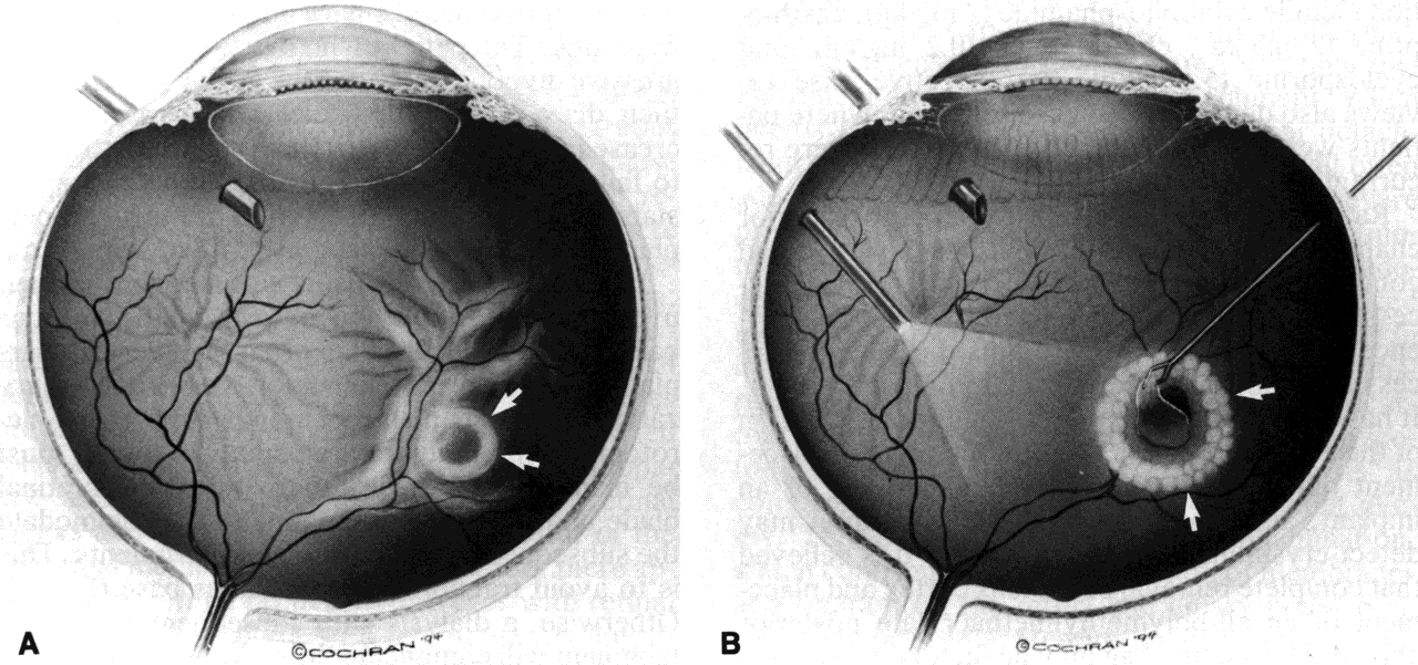 of closure of laser iridectomies by inflammatory debris or pigment. Formation of cataracts is often the result of a chronic inflammatory disturbance of the lens. Chronic use of corticosteroids adds its own cataractogenic influence. The result is a patient with cataract lens opacities that play a role in what is often decreased vision based on this and other problems. The discussion of isolated cataract removal is to follow. Cataracts in patients with posterior uveitis often exist with vitreous opacities, macular edema, or macular cellophane membranes or macular pucker. The combination of pars plana vitrectomy with cataract extraction not only clears the visual axis but may reduce the severity and incidence of recurrences of inflammation. Recent series in the literature support this. Each series has emphasized the need for preoperative control of inflammation by use of topical and periocular corticosteroids with several repeated injections if necessary, usually 2 to 3 weeks apart, and oral nonsteroidal anti-inflammatory medicines. The patient may need oral corticosteroids or immunosuppressive therapy. Drugs reported in the literature that are used in the preoperative control of inflammation include cyclophosphamide (2 mg/kg), azathioprine (2 mg/kg), chlorambucil (0.2 mg/kg), and cyclosporine (5 mg/kg). Retrospective case reviews also demonstrated case selection, where patients were not operated on if they had severe recurrent inflammation.13–23 Rationale for the decision to implant posterior chamber intraocular lenses continues to grow, and conditions in which this has been performed successfully continue to be defined by recent experience and publications. Care must be taken to access the stability of the capsular zonular strength. It has been reported that inflammatory destruction of the zonules may lead to intraoperative displacement during the placement or positioning of an implant, and that preoperative examination may detect crystalline lens subluxation.24 It is believed that complete removal of the lens cortex and placement of an all-polymethylmethacrylate posterior chamber lens in the bag may be factors in reducing postoperative inflammation. Phacoemulsification, planned extracapsular extraction, and ultrasonic fragmentation via the pars plana have all been successfully used to remove the lens in these patients. Surgeons have reported complications in uveitis patients even after technically ideal cataract surgery with or without posterior chamber lens implantation. Visual rehabilitation is limited by cystoid macular edema, pupillary membranes, dense capsular opacities, postoperative hemorrhage from abnormal iris vasculature, hypotony, and chronic postoperative inflammation. Aggressive medical control of the inflammatory process is repeatedly suggested as an adjunct to improved visual outcome. The underlying destructiveness of the inflammatory process and the natural history of the disease should be considered in selecting patients for cataract extraction and intraocular lens implantation. First, as previously mentioned, pars plana vitrectomy can be done in combination with cataract extraction, or it can be done to clear vitreous debris. Second, in several published studies, vitrectomy has been observed to lessen the frequency and severity of recurrences of inflammation. These studies have included patients with intermediate uveitis and chronic posterior uveitis.25–27 Third, patients with iris bombé and initially elevated intraocular pressure who do not respond adequately to medical and anti-inflammatory management may require mechanical clearing of the pupillary and retropupillary space. Lastly, advanced vitreoretinal surgical procedures may be needed to repair complex tractional detachments of the retina that may be combined with a rhegmatogenous component or an associated ciliary body detachment with hypotony. The patient who develops chronic progressive hypotony is usually in the end stage of their disease. When medical measures fail to increase intraocular pressure, the cause is attributed to failure of the ciliary body. These eyes may be stabilized for an extended period of time with pars plana vitrectomy and a complete fill of silicone oil. In patients with vitritis as a component of their uveitis, organization and fibrosis of the vitreous base area can occur. This often includes the pars plana area. Dense organization and neovascularization of the pars plana occur in pars planitis. Sclerotomy at the time of pars plana vitrectomy must be made with a fresh, sharp microvitreoretinal blade and must be large enough to accommodate the subsequent passage of other instruments. This is to avoid traction on the vitreous base (Fig. 2). Otherwise, a dialysis with subsequent retinal detachment will complicate the surgery. Cryotherapy of the sclerotomy sites at the conclusion of surgery may help to prevent postoperative retinal detachments from a break in this area. The combination of external cryotherapy of the pars plana and vitrectomy in pars planitis patients has been reported to be complicated by giant retinal tears presumably at the edge of the cryotherapy.27 Retinal detachment in eyes with uveitis may be due to an isolated rhegmatogenous mechanism or a combined traction-rhegmatogenous mechanism. Posterior vitreous separation caused by vitreous inflammation can lead to retinal breaks and cause retinal detachment. Often the retina can be reattached with a scleral buckling procedure. If there is significant vitreous opacity, vitrectomy and scleral buckling may be required to reattach the retina. Fibrous or even fibrovascular proliferation associated with uveitis can cause or complicate retinal detachment. Pre-existing epiretinal membranes present before retinal detachment can lead to fixed folds and a picture of proliferative vitreoretinopathy after retinal detachment, whether retinal breaks and retinal detachment are a result of the epiretinal membranes or not. In addition, the