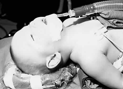 Fig. 2. A laryngeal mask airway with flexible reinforced tube is in place in this infant.