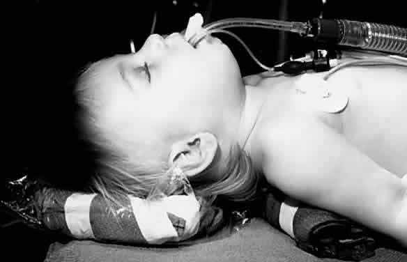 Fig. 1. An infant is positioned for ophthalmic surgery. A preformed curved endotracheal tube is in place.
