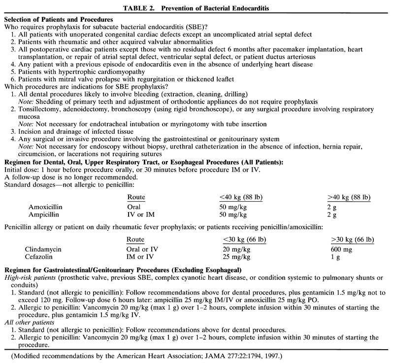 Preoperatively, antibiotics may be administered as prophylaxis against infection, especially for SBE in a child with congenital heart disease. Antibiotics may be administered intravenously immediately after induction of anesthesia and placement of the intravenous catheter and before intubation and start of surgery. Ampicillin, 50 mg/kg, is recommended; if an allergy to penicillin or cephalosporin antibi-otics exists, clindamycin (20 mg/kg) or vancomycin(20 mg/kg) is prescribed. Vancomycin can cause hypotension, so it must be administered over a 1-hour period (see Table 2).