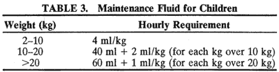 Fluids to be administered perioperatively are divided into four categories: maintenance, deficit, third-space loss, and blood replacement. The last two categories are unnecessary for most elective ocular procedures. Hourly maintenance fluid is calculated by the child's weight: 4 ml/kg for the first 10 kg, plus 2 ml/kg for each kilogram between 10 and 20 kg, plus 1 ml/kg for each kilogram over20 kg (Table 3). The ideal maintenance fluid to provide for metabolic needs is 2.5% to 5% dextrose in 0.25 normal saline (NS); however, usually Ringer's lactate (RL) is administered intraoperatively to provide both maintenance as well as deficit fluid replacement to ensure that adequate sodium is provided. Glucose solutions may be administered to infants less than 2 months of age intraoperatively because hypoglycemia is otherwise undetected under general anesthesia. In adults and healthy children who have fasted for only 3 hours, hypoglycemia is unlikely to occur during an anesthetic of short duration.9 Endogenous catecholamine release during induction of anesthesia and surgery usually increases blood glucose intraoperatively. Administration of excessive amounts of dextrose is also undesirable, because osmotic diuresis may result.