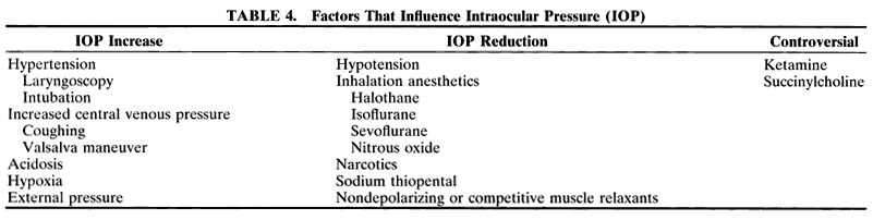 Most anesthetics and neuromuscular blocking drugs reduce IOP, with the possible exceptions of ketamine and succinylcholine. Ketamine has various effects; early studies showed an increase in IOP after intramuscular or intravenous administration of the drug. More recent studies have found that after premedication with diazepam and meperidine intramuscular administration of ketamine does not affect IOP, and sometimes it even lowered IOP in children. Succinylcholine causes a transient (4 to 6 minutes) increase of 10 to 20 mmHg in IOP. For this reason, use of succinylcholine in a rapid-sequence induction in a child with an open-globe injury is controversial. Whether IOP can be reduced with intravenous sodium thiopental and lidocaine, or administration of halothane by mask so that the effect of succinylcholine is not clinically significant is difficult to ascertain. Pretreatment with nondepolarizing neuromuscular blocking drugs before administration of succinylcholine does not consistently prevent this increase in IOP; however, no cases of loss of vitreous humor have been reported during administration of curare-barbiturate-succinylcholine. Alternatively, a nondepolarizing neuromuscular blocker with rapid onset such as rocuronium may be administered to facilitate intubation; however, the duration of paralysis is longer than with succinyl-choline. After muscle relaxation occurs, cricoid pressure is applied to compress the esophagus, to prevent aspiration of gastric contents during rapid sequence induction of anesthesia. If a mask induction with halothane is necessary in a pediatric patient, cricoid pressure should be used until intubation has been accomplished. Because laryngoscopy and intubation increase IOP, an appropriate depth of anesthesia must be achieved first to compensate for this increase.