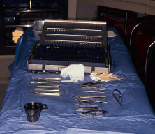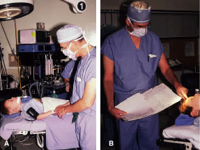PREPARATION Instrument selection is reviewed by the surgeon (Fig. 1). The patient is positioned so that the head is stabilized, and a shoulder bolster or “roll” is placed under the patient's shoulders to extend the neck slightly (Fig. 2A). The patient is identified, as is the eye to receive surgery (see Fig. 2B).