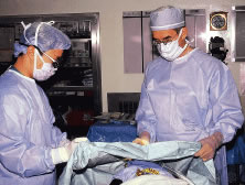 The eyelids and surrounding skin are prepared with two scrubs using a 10% povidone iodine (Betadine) solution that is diluted 50:50 with warm saline38–41 (Fig. 3A and B). The conjunctival cul-de-sacs are irrigated with a bulb syringe and warm saline. Silver protein precipitating solutions, such as Argyrol are not used. A drop of 1% phenylephrine hydrochloride may be instilled into the conjunctival cul-de-sacs to reduce conjunctival bleeding (Fig. 4). The surgical field is isolated with a sterile adhesive barrier drape (see Fig. 4 and Fig. 5). The instrument tray is positioned, and sterile cotton-tipped applicators are placed on either side of the head so that they are available for sponging the field (Fig. 6). A wet-field or bipolar cautery is available. The surgeon is seated at the head of the operating table. The assistant sits to the left of the surgeon, and the surgical technician sits to the right (Fig. 7). Consistency in the procedures that are used to prepare a patient for surgery, such as positioning of the patient and location of the surgeon and the assistants, helps to eliminate confusion among the operating room staff before each procedure. Surgical instruments can be placed on a Mayo stand if a surgical technician is not available to pass instruments to the surgeon (see Fig. 6). The clinical record is positioned where the surgeon can refer to it.