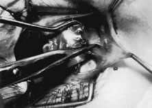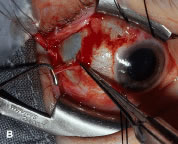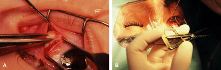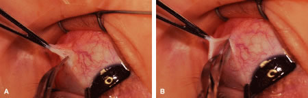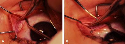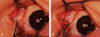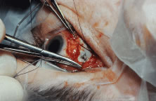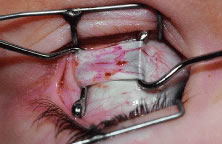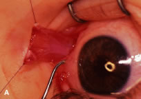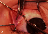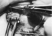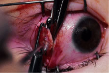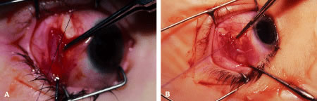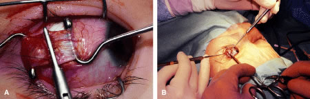 Figure 54 shows the conjunctiva being elevated by the assistant with Castroviejo forceps. The anterior extension of the muscle can be seen.