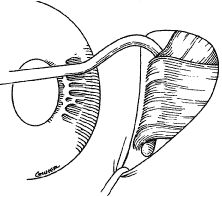 and the “surgeon.”1–4 The results of Taylor's procedure are not reported. In 1839, Johann Freidrich Dieffenbach, of Berlin, successfully performed the first myotomy of an internal rectus muscle.1–5 Surgery was performed without antisepsis or skin preparation; the patient sat in a chair during the procedure. Even though Dieffenbach's procedures were performed before general anesthesia was available, restraint of the patient was discouraged. Three assistants, and as many as seven instruments, were used to perform the procedure. An incision was made into the nasal conjunctiva, and muscle tissue was brought into the wound and severed.5 The operation was considered to be “among the most valuable surgical improvements of this age.”5 Florent Cunier performed a myotomy of a lateral rectus only 3 days after Dieffenbach's procedure.4,6 Jones,7 in an 1847 textbook on the principles and practice of ophthalmic medicine and surgery, showed the primitive level of understanding of the causes and nonsurgical treatment of strabismus. One of the treatments for convergent strabismus included a “calomel purge or two,” or mercurial chalk given orally with a laxative, followed by “tonics.” When these measures failed, “section of the internal rectus muscle” was recommended. To accomplish this treatment, a vertical incision was made through the conjunctiva, and the internal rectus muscle was grasped with toothed forceps. A bent probe or a blunt hook was placed behind the tendon of the internal rectus, and the tendon was cut from its insertion, resulting in a free tenotomy. Two assistants were recommended, one to separate the eyelids and one to sponge blood to provide better visualization. Scleral perforation with loss of vitreous was listed as an uncommon complication.7 In 1853, von Graefe recommended performing a tenotomy at the insertion rather than a myotomy. He should be credited with providing a better understanding of the anatomy of the extraocular muscles. He refined the procedure by applying information gained after cadaver dissection. He recommended preserving Tenon's capsule and the “muscle sheaths.”3 He also introduced new instrumentation to perform surgery. In 1892, in a translated textbook of ophthalmology by Fuchs, Duane recounted recent advances in strabismus surgery.8 Topical application of cocaine was used for anesthesia. If convergent strabismus was found to be large, surgery was performed on both eyes. The surgical technique used at the end of the 19th century consisted of grasping the internal rectus muscle with forceps through a conjunctival incision made over the muscle insertion. The muscle was cut from its insertion. If an overcorrection occurred, advancement of the internal rectus muscle was recommended. This maneuver was accomplished by passing a silk suture through the conjunctiva at the limbus and attaching it to the muscle that was subsequently retrieved with a forceps. Scarring of the conjunctiva was recognized as a complication, as were exophthalmos and “sinking in of the caruncle.”8 Patients with divergent strabismus were treated with tenotomy of the lateral rectus muscle with a similar technique. Overcorrections were reported as “uncommon.” Tenotomy of the inferior rectus muscle was advocated to elevate eyes that had an inferior iris coloboma so that the visual axis could pass through the coloboma.8 In 1913, in a book titled Ophthalmic Surgery, Metter and Sweet9 recommended the use of a local anesthetic, either topical or subconjunctival, for muscle advancement procedures. To weaken the internal rectus muscle, a tenotomy was performed at the insertion of the muscle. They graded the effect by regulating the extent of the tenotomy. If an eye was undercorrected, silk support sutures were secured at the temporal limbus, passed through the upper and lower eyelids, and tied externally for 24 hours to hold the eye in an abducted position. If the operation produced an overcorrection, a “counteracting suture” was added. This suture was placed through the conjunctiva at the nasal limbus, passed back through the muscle tendon, and tied on the conjunctival surface. A tenotomy combined with an advancement procedure of the ipsilateral antagonist muscle was recommended to treat the “highest grades” of convergent strabismus.9 In 1936, in an essay on the treatment of concomitant strabismus, Travers10 stated that tenotomies of the medial rectus muscle “yielded unsatisfactory results” because “there were three times as many overcorrections as satisfactory results.” He recommended a recession of the internal rectus muscle combined with an advancement procedure of the lateral rectus muscle, to treat convergent strabismus. Surgery was performed “early”; in most cases, patients were between 3 and 6 years old. To recess a muscle, three fine chromic catgut sutures were inserted into the sclera as far behind the old insertion as one wished to displace the muscle. Sutures were passed through a portion of the muscle, which was held with a Prince forceps.10 Over the last four decades, three techniques for gaining access to a rectus muscle have been described. In 1954, Swan and Talbot11 advocated making a vertical conjunctival incision behind the insertion of the muscle. This incision was followed by a second incision into Tenon's capsule that was made parallel to the rectus muscle. “Intermuscular membranes are cut with blunt tipped scissors and fine absorbable sutures, threaded on small atraumatic cutting needles,” were used to secure the muscle to its new position. Two approaches were described in the 1960s. von Noorden12 used illustrations to detail the steps needed to gain access to a rectus muscle through an incision made at the limbus. A conjunctival incision was made at the limbus with blunt-tipped scissors. The conjunctiva and Tenon's tissue anterior to the muscle insertion were reflected so that the muscle could be visualized directly. Follo