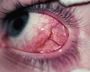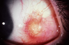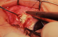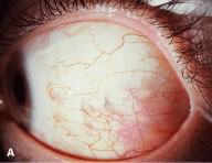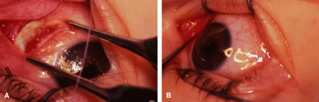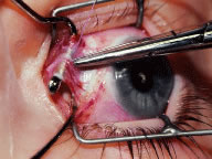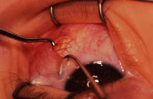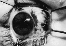 Endophthalmitis can result from inadvertent scleral perforation. Use of prophylactic antibiotics may be considered. Systemic intravenous therapy is used to treat cellulitis, and appropriate measures should be initiated promptly if endophthalmitis is suspected. VASCULAR COMPLICATIONS Anterior segment ischemia or necrosis can occur after rectus muscle surgery.35,57,58 Usually, ischemia occurs after removal of the third or, more commonly, the fourth rectus muscle. Predisposing factors are thyroid eye disease, sickle cell anemia, and prior strabismus surgery. Recovery of ocular function after ischemia usually occurs within weeks.59 To avoid this complication in patients at risk, surgeons should use a cul-de-sac approach to gain access to the rectus muscle.60 This approach to the rectus muscle preserves the conjunctival circulation at the limbus. The limbal circulation does not have an important role in nourishing the anterior segment. However, the conjunctival vessels anastomose with deeper vessels, and this approach may provide added safety in borderline cases. Patients at risk can be pretreated with aspirin 3 days before surgery. Oxygen requirements may be reduced by treating inflammation with a topical or oral corticosteroid. The surgical strategy to correct a deviation should be planned so that as few rectus muscles as possible are repositioned. PYOGENIC GRANULOMA-CONJUNCTIVAL CYST About 1 of every 100 strabismus operations will be complicated by the development of exuberant granulation tissue at the site of the conjunctival incision (Fig. 80). Tenon's capsule can protrude through the conjunctival incision and produce an exuberant granulation response. Granulation tissue is treated with frequent application of topical antibiotic-steroid drops. The granuloma usually will become pedunculated and drop off of the site. If the base is broad, the tissue is lifted with a forceps and removed with a scissors.