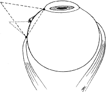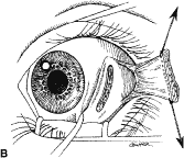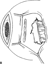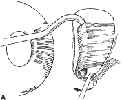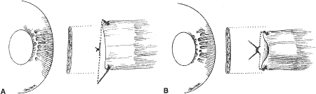 A Castroviejo caliper is used to mark a point on the sclera at a predetermined distance from the posterior portion of the muscle insertion (Fig. 31). Some surgeons prefer to mark the sclera the using the limbus as a reference point. These surgeons believe that it is more accurate to measure from the limbus than from the insertion of the rectus muscle because the insertion may have some anatomic variation. If a large recession procedure will be performed, measurement from the limbus will introduce a cord effect that will increase the amount of recession achieved (Fig. 32). To reduce this effect, William Scott has designed a curved ruler that provides a more accurate measurement of the arc. It is important for the surgeon to be careful and consistent with the measurement technique so that the effect of the surgical procedures can be critically evaluated. The needle is grasped with a locking Barraquer needle holder at the middle portion of the shaft. Grasping the S wedged portion of the needle can cause the needle to roll within the jaws of the needle holder and this can increase the risk of penetration of the sclera. At the mark created by the caliper, there is usually a small dimple or depression in the sclera. The mark results from expressing water from the sclera so that the blue color of the uvea is seen. Because the muscle will attach to the globe at the point at which the needle tip enters the sclera, care is taken to start the intrascleral needle pass at the point marked by the caliper (Fig. 33). Care should be taken not to introduce any unintentional supraplacement or infraplacement effect of the tendon at the new insertion. The width of the insertion should be preserved: The width of the new insertion should equal the width of the original insertion. If the width of the insertion is not preserved, the muscle will not pull up to the new insertion evenly (Fig. 34A and B). If there is a sag in the new insertion caused by the new insertion site being too narrow, the suture can be passed back through the insertion to pull the center of the sagging muscle tendon back to the insertion (Fig. 35). The fine wire needles need to be passed following the curvature of the needle tip. Attempts to elevate the tip of the needle while it is in the sclera can cause the needle shaft to bend (Fig. 36A and B). Some surgeons advocate a “crossed-swords technique” so that the second needle pass does not cut the suture from the first needle pass. With appropriate magnification, the other end of the suture is easily avoided. Once the needles have been passed through the sclera, the muscle is pulled up to its new insertion (Fig. 37). A Stevens' hook is used to keep the Tenon's and other surrounding tissue from being drawn into the insertion. The synthetic absorbable sutures tend to drag Tenon's tissue when the suture comes in contact with this tissue. Coating the suture tends to minimize this problem but does not completely eliminate it. The muscle is tied with a surgeon's (double throw) knot that is further secured with two or three square knots. The new insertion is checked and measured to verify that the muscle is in the desired position. After the measurement is checked, the locking Castroviejo forceps are removed. The conjunctival edges of the wound are repositioned or swept closed with a muscle hook. The wound is not sutured. After the procedure, we do not use ointments or occlusive dressings. A drop of an antibiotic-steroid solution can be applied at the discretion of the surgeon. RESECTION PROCEDURE: FORNIX INCISION This procedure is a resection of a lateral rectus muscle. The approach to the rectus muscle to be resected is similar to that of the recession. The limbus is grasped with a Lester forceps. The globe is rotated up and away from the muscle to be resected. The conjunctiva is incised, and the rectus muscle is grasped with a Stevens' hook that is replaced with a Jameson hook. The Tenon's tissue and intermuscular septa are cut and reflected onto the Jameson hook. The intermuscular septa are cut with a Westcott scissors. The rectus muscle tendon is then suspended between the Jameson muscle hook (Fig. 38).