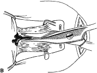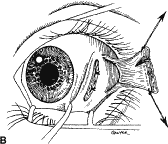The globe then is gently elevated from the orbit or proptosed at the same time it is abducted or adducted to prepare for the incision. Elevation of the globe helps to separate the horizontal rectus muscle from the inferior rectus muscle so that the inferior rectus muscle is not cut when the incisions are made. The conjunctiva is grasped by the assistant with a Manhattan toothed forceps (Fig. 10). This forceps has teeth that are angled outward and are designed to grasp conjunctiva, as well as the deeper subconjunctival tissue, so that when the blunt-tipped Westcott scissors cuts into the tented tissue, an incision is made into the conjunctiva and Tenon's capsule (Fig. 11A and B). If the incision does not completely penetrate Tenon's capsule and the intermuscular septum to the scleral surface of the eye, additional tissue (anterior Tenon's tissue and/or intermuscular septum) is grasped with the Manhattan forceps and at least one additional cut is made. A Stevens' tenotomy hook is passed by the surgeon into the incision and is rotated so that it can be slid underneath the muscle insertion with the tip of the hook held tangential to the globe (Fig. 12). The hook should be passed 2 to 3 mm posterior to the expected location of the muscle insertion. Care is taken not to incorporate intramuscular septum or other adventitial tissue on the hook. When the lateral rectus muscle is secured with the Stevens' or Jameson muscle hook, care should be taken not to bring the inferior oblique muscle up to the insertion (Fig. 13). When the muscle is secured with the Stevens' hook, the hook and the inferior edge of the muscle insertion are elevated and a Jameson muscle hook is passed between the tented muscle tissue and the sclera to secure the muscle at its insertion (Fig. 14). Care is taken to include the entire insertion of the tendon on the hook. The tip of the Jameson hook is gently elevated by depressing the heel of the hook. This maneuver helps to ensure that the entire tendon of the muscle remains captured on the hook. A Stevens' tenotomy hook is placed in the incision, this time anterior to the insertion beneath the conjunctiva (Fig. 15). The Stevens' hook is passed posterior over the orbital surface of the muscle (Fig. 16). Gentle pressure on the Stevens' hook is directed posterior so that the check ligaments and Tenon's tissue that overlie the muscle belly are separated from the muscle capsule with blunt dissection. The hook usually is passed posterior for about 10 mm. When recessing a lateral rectus, attachments between the underside of the lateral rectus and inferior oblique are broken (Fig. 17). Two or three passes over the muscle are made, and, with simultaneous countertraction on the Stevens' hook and the Jameson hook, the conjunctiva is elevated and pulled over the tip of the Jameson hook (Fig. 18A and B).