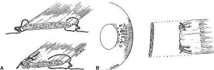 SLIPPED MUSCLE If the muscle becomes completely detached from the globe and contracts posteriorly, the term “lost” muscle is used. A muscle that moves from its desired location is called a slipped muscle.43–46 Causes of a slipped muscle include untying of the knot (Fig. 77A and B), inadvertent cutting of the suture, placing the suture too close to the insertion, or taking an inadequate bite of sclera with passage of the needle. In the latter case, the suture will “cheese wire,” or pull through the sclera. Finally, if the suture engages only the muscle capsule and not the tendon, the tendon can slide posterior within the muscle capsule. Because the maximal pull, or force, generated by an extraocular muscle is only 50 g, insufficient strength of the suture material is seldom the cause of a slipped muscle. SCLERAL PERFORATION Recognized and unrecognized scleral perforation will occur. Reattachment of the muscle to the globe requires passing a needle within the sclera. The scleral coat of the globe is thinnest just posterior to the insertion of the rectus muscles. If the sclera becomes dry, it will thin further, and the blue color of the underlying uveal tissue will be visible. Needles with specially designed spatula tips are used to draw the sutures through the scleral tissue. Adequate illumination and magnification will facilitate this procedure. If the operation is prolonged, periodic wetting of the cornea and sclera with saline or a balanced salt solution will reduce thinning resulting from desiccation. In addition, adequate exposure and stabilization of the globe will reduce this complication. Scleral perforation also can occur when the needle is in the sclera and the surgeon attempts to lift the tip of the needle by placing torque on the needle with the needle holder (see Fig. 36). The fine-wire needles will bend, and, when the needle is released, the tip is directed posterior or into the sclera. Unexpected movement of the patient also may cause perforation of the globe (Fig. 78).