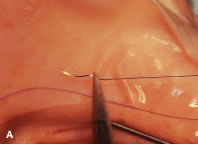 A fine-wire spatula-tip needle is woven through the muscle or tendon. Care is taken to avoid the anterior ciliary vessels on the orbital surface of the muscle (Fig. 39). The resection effect is achieved by measuring the location of the transverse suture from the posterior portion of the Jameson hook at the insertion to a predetermined point on the muscle tendon. Various locations can be used as reference points. This measurement can be taken from the anterior, middle, or posterior portion of the Jameson hook under the muscle. Periodic review of the effects of the operation will determine the amount of surgical correction that is achieved for each surgeon's individual technique. The suture is passed back through the tendon on the origin of the muscle side of the transverse suture. The suture is secured to the tendon with double-throw lock knots (Fig. 40). The muscle is clamped with a fine-tipped vascular clamp (Fig. 41A). A vascular clamp is used because it minimizes the crush damage to tissue that is held in the clamp. Care is taken not to include the transverse suture or any of the lock knots in the clamp. The clamp is stabilized on the drape with a towel clip (see Fig. 41B). A Stevens' hook is used to pull the conjunctiva and anterior Tenon's tissue away from the muscle, and a Westcott scissors is used to cut the muscle free from its insertion (Fig. 42). The muscle stump that is to be resected is grasped with forceps and elevated from the clamp. The resected tendon is then cut free from the clamp with a Westcott scissors (Fig. 43). The sutures are pulled away from the jaws of the clamp by the assistant so that they are not cut. A wet-field cautery is used to cauterize the stump of muscle that is held in the clamp (Fig. 44). The muscle insertion is grasped with a locking Castroviejo forceps in the center of the insertion. Each needle is passed from the upper or lower (for a vertical rectus, medial or lateral) pole of the insertion to exit near the center of the old insertion. The intrascleral bite is made in sclera that is just anterior to the insertion. This location is used to allow the needle to pass through the thickest portion of the sclera (Fig. 45). At the midpoint of the insertion, the tip of the needle is brought out of the sclera and the needle is regrasped and passed through the central portion of the muscle tendon on the origin side of the previously placed transverse suture (Fig. 46). A double-throw knot is tied, and the knot is pinched by the surgeon's index finger and thumb (Fig. 47A and B). The muscle clamp is removed, and the knot is pulled down to the muscle by elevating the suture and snugging it down in a stepwise fashion. Two or three additional square knots are added to secure the muscle to the new insertion (Fig. 48). The muscle is inspected to verify that Tenon's tissue is not drawn into the insertion. The knot is trimmed, and conjunctiva is reposited over the muscle with a Stevens' hook (Fig. 49).