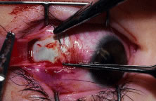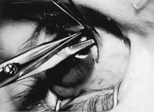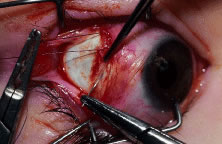 The muscle is cut free from its insertion (Fig. 69). The surgeon holds the Jameson clamp to elevate the muscle from the globe, and, using the other hand, the surgeon cuts the muscle free from the globe. The muscle stump is cut so that it is flush with the globe.