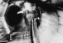 RECESSION PROCEDURE: LIMBAL APPROACH The surgeon and the assistant sit opposing each other on either side of the patient's head. The surgical technician is located between the surgeon and the assistant. Two 6-0 silk stay sutures are passed through the conjunctiva and superficial scleral tissue at the limbus (see Fig. 49). These sutures are used to stabilize the globe during the procedure. These stabilizing sutures attached to bulldog clamps will hold the globe in adduction or abduction as required. A no. 15 surgical knife or other similar instrument is used to penetrate the conjunctiva at the limbus (Fig. 50). Care is taken to approach the limbustangential to the globe so that inadvertent penetration of the sclera or cornea is avoided. A Westcott scissors also may be used to incise the conjunctiva at the limbus. To facilitate this step, conjunctiva is lifted gently with a 0.5-mm Castroviejo forceps (see Fig. 50).