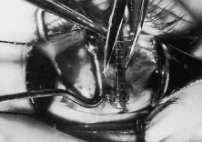 The assistant holds the Castroviejo caliper that marks the location of the new insertion (Fig. 59). Care is taken to locate it directly posterior to the stump of the old insertion and to avoid inadvertent supraplacement or infraplacement of the new insertion.