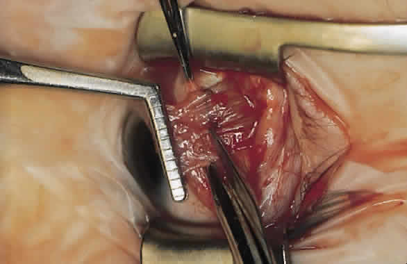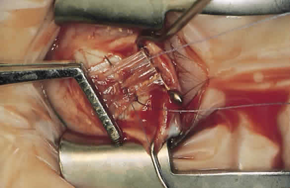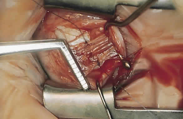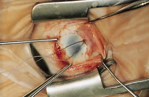 Other Considerations If hypertropia is present along with intermittent exotropia, the first consideration is whether the hypertropia is present at distance and near fixation and whether any dysfunction of the oblique muscles is present. If the deviation is present at both distance and near when the patient is dissociated into the exotropic phase, no oblique muscle dysfunction is seen, and the vertical deviation is a true vertical deviation as opposed to a dissociated vertical deviation, then surgical correction of the vertical deviation is indicated if the amount is 8 PD or more. A vertical deviation that is present only at distance and not at near is ignored in the surgical plan.34 In the rare instance when this far-near dissociated hypertropia is associated with a unilateral inferior oblique overaction, the inferior oblique muscle should be weakened along with the surgery on the horizontal muscles. If an A or V pattern is present in conjunction with the intermittent exotropia, the function of the oblique muscles must be evaluated. If the inferior oblique muscles are overacting in the presence of a V pattern and the superior oblique muscles are overacting in the presence of an A pattern, this dysfunction must be considered in the surgical plan. In V patterns, the overacting inferior oblique muscles should be recessed if the superior oblique muscles are normal or underacting. If the superior oblique muscles are also overacting, then careful consideration must be given to the effect of the oblique muscle dysfunction on the V pattern and the effect that recessing the overacting inferior obliques will have on the pattern. Pseudooveraction of the inferior oblique muscles should be suspected when tight lateral rectus muscles are associated with exotropia. In this situation, it is believed that the lateral rectus muscle of the exotropic eye becomes tight or contracted. When the eye is taken into adduction and slight upgaze, the tight lateral rectus muscle slides around the globe, causing the eye to elevate and to simulate overaction of the inferior oblique muscle. This concept was first suggested by Jampolsky. In A pattern deviations, if the inferior oblique muscles are normal or underacting, weakening the overacting superior oblique muscles can help collapse the pattern. However, if the inferior oblique muscles are overacting, care must be taken if a tenotomy of the overacting superior oblique muscles is performed because the A pattern may be converted to a V pattern. For both A and V patterns, when weakening the overacting oblique muscles is part of the surgical plan, surgery for the exodeviation should be done as measured in primary gaze position and without consideration for any oblique surgery that is done. Most strabismologists support this approach in patients who have a V pattern with overacting inferior oblique muscles. However, controversy exists when an A pattern is associated with overacting superior oblique muscles. Some authors report no change in the exodeviation in primary gaze position after surgical weakening of overacting superior oblique muscles is performed.35–38 Others report an inward shift of the eyes in primary gaze position after surgical weakening of overacting superior oblique muscles has been performed in patients with A pattern strabismus.39,40 In a series of eight patients with A pattern exotropia and overacting superior oblique muscles, Biglan noted a mean reduction of 8 PD (from 12 to 4) in the amount of exodeviation seen in primary gaze position after tenotomy of the superior oblique muscles.41 This difference in findings could be the result of different surgical techniques, such as performing the superior oblique tenotomy on the nasal versus the temporal side of the superior rectus muscle. When the oblique muscles are judged to be functioning normally in the presence of an A or V pattern, vertical displacement of the recessed or resected horizontal rectus muscles is required to treat the pattern. The recessed lateral muscles are moved down for an A pattern and up for a V pattern, and the resected medial muscles are moved in the opposite direction. When a muscle is infraplaced or supraplaced, the question arises as to how the recessed or resected insertion should be placed. The surgeon must determine whether the insertion should be moved and placed parallel to the original insertion, parallel to the limbus, or at a location between the two. Another suggestion is that the displaced pole (inferior pole in infraplacement and superior pole in supraplacement) should be recessed further or placed further posterior than the other pole to create a greater effect and limit any torsional effect. I prefer to make the new insertion parallel to the original insertion. Surgical Technique I favor a fornix incision more than a limbal incision unless extensive scarring from previous surgery makes the limbal approach a better option. A double-armed 6-0 Polyglactin 910 suture coated with polyglactin 370 (coated Vicryl) is used. This synthetic absorbable suture is 18 in long. For a recession, the suture is placed in the muscle 1 mm from the scleral insertion. One end of the suture is started near the middle of the muscle (tendon) 1 mm back from the sclera and is passed into the belly of the muscle, exiting at the lateral margin (Figs. 1 and 2). The needle is passed back through the muscle, perpendicular to the plane of the muscle and 1.5 to 2 mm in from the muscle edge to create a lock bite (Fig. 3). The suture is double locked. The other end of the suture is passed similarly, from the middle of the muscle through the muscle belly, out the other side. A lock bite is taken. This suture placement is a modified von Pirquet technique that was popularized by Parks.42