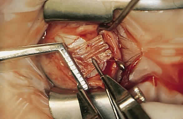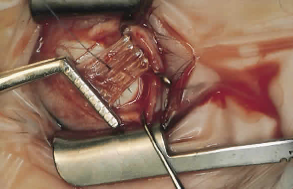 After the sutures have been placed, the muscle is disinserted from the globe with Westcott scissors. The cut is made as nearly flush to the globe as possible, and a minimal stump from the original insertion is visible under the replaced conjunctiva postoperatively. The advantage of this technique is that the suture that passes through the muscle between the lock bites at each edge maintains the normal width of the muscle when the muscle is removed from the insertion and resutured to the globe (Fig. 4). Placing the suture more than 1 mm from the insertion results in a resection as well as a recession and decreases the expected effect of the recession. The caliper is set at a predetermined amount to mark the site of the new insertion. The sclera is marked for needle placement directly posterior to one pole of the original insertion. The mark and the start of the subsequent needle pass must be made perpendicular to the end of the insertion to eliminate unintentional supraplacement or infraplacement. The second mark is made perpendicular to the other end of the original insertion (Fig. 5). The needles are passed so that their tips cross (Fig. 6). This placement allows the knot to be tied on a spot rather than around the curve of the globe. Tying a knot around the curve of the globe is similar to tying a string around a ball. After the muscle is pulled up and the knot is tied, each end as well as the middle of the muscle is measured with the caliper from the original insertion (Figs. 7 and 8). If the middle of the recessed muscle is sagging more than 0.5 mm, then one end of the suture is brought up through the middle of the muscle. The needle is passed just behind the area where the preplaced suture passes through the muscle. The middle of the muscle is then pulled up when the suture that is placed through the middle of the muscle is tied to the other end of the suture. It is important to measure from the same place on the muscle insertion, either the anterior, middle, or posterior part. I find it easiest to measure from the posterior edge because it is usually the most distinct landmark after muscle disinsertion. The accuracy of recessions should be within 0.5 mm. When a resection is performed, the medial rectus muscle is isolated. The muscle is cleaned of anterior Tenon's tissue and intermuscular septum back for 3 to 4 mm more than the amount of planned resection to allow for suture placement in the muscle. During a resection, a Jameson muscle clamp is placed around the muscle (tendon) as close to the insertion as possible (Fig. 9). With a caliper, the amount of muscle to be resected is measured back from the insertion on the belly of the muscle (Fig. 10). The double-armed 6-0 Polyglactin 910 suture is placed in the muscle at this point, following the procedure that is used for a recession. One end of the suture is locked at each margin of the muscle (Figs. 11, 12, and 13). The muscle is then disinserted. The preplaced sutures are positioned in the original scleral insertion. One is started at each end of the insertion, and both exit in the middle (Figs. 14 and 15). The sutures are passed up through the muscle belly, just behind the preplaced suture (Fig. 16). The Jameson clamp is used to position the muscle across the insertion at the level of the preplaced sutures, and the sutures are tied (Fig. 17). The muscle distal to the suture is then exercised (Fig. 18).