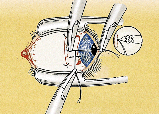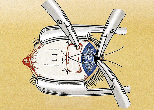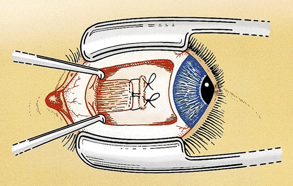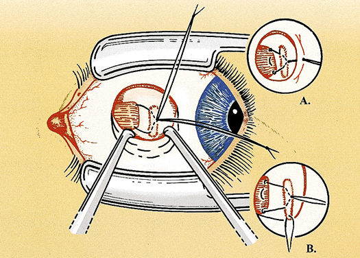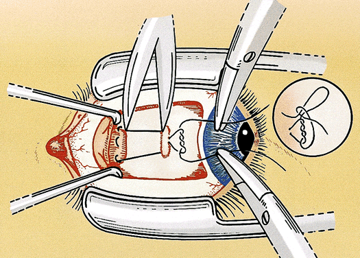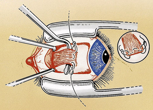 It can be difficult to accurately determine how much the muscle was moved during the adjustment. One approach to this problem is to tie an extra piece of suture around one or both ends of the adjustable suture at a predetermined distance from the scleral tunnels. The sliding adjustable knot works best with this technique. This measuring or marking suture is a reference point for determining the amount of adjustment. The suture is removed after the adjustment is completed.22 Another useful modification of the adjustable suture technique is to use a scleral traction suture. The traction suture reduces the chance of pain and hemorrhage during the adjustment by providing a handle to stabilize the eye. The suture is placed as a moderately deep scleral bite, 2 to 4 mm from the limbus, and tied in a loose loop. It is best to place the traction suture inferior and anterior to the muscle insertion for horizontal muscles and temporal and anterior to the muscle insertion for vertical muscles (see Fig. 4). The ideal suture for adjustable strabismus surgery is absorbable and strong, ties securely, and offers minimal tissue resistance.23 Most strabismus surgeons use 6-0 synthetic absorbable suture made of polyglactin 910 or polyglycolic acid. Either suture can be used for all of the adjustable techniques and modifications. Spatulated needles are preferred by most surgeons for adjustable suture surgery. The conjunctiva also can be closed with the same suture but a more rapidly absorbing suture (i.e., 6-0 or 7-0 plain gut or chromic gut) is tolerated better by most patients. Adjustable suture strabismus surgery is almost exclusively restricted to rectus muscles. Suture adjustment is difficult on the oblique muscles because of the posterior orientation of the muscle insertion. A technique for tucking the superior oblique tendon that provides a limited postoperative adjustment has been described.24 An adjustable suture approach to the anterior fibers of the superior oblique tendon for the treatment of excyclotorsion also has been developed.25 |