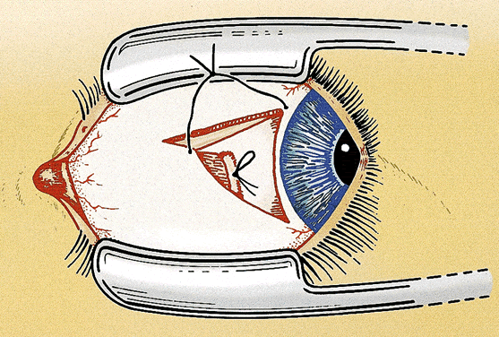 After the needles are removed, the suture ends are tied together loosely with a double throw. The eye is rotated away from the recessed muscle (i.e., laterally if the medial rectus muscle is adjusted) to allow the muscle to retract posteriorly beyond the intended position of recession. A mark is placed on the sclera with Castroviejo calipers preset to the desired amount of the recession from the original muscle insertion. The double throw is tightened until the muscle is pulled up to the scleral mark and the poles of the muscle are equal distance from the insertion. A loop or slip knot is placed over the double throw to secure the suture (Fig. 3). The conjunctiva is closed with 7-0 chromic suture. The conjunctival flap is pulled up until it partially covers the adjustable knot. The relaxing incisions may be closed with additional sutures if necessary (Fig. 4). The ends of the adjustable suture are taped to the skin of the lower lid or tucked into the lower cul-de-sac and held in place with an antibiotic-steroid ointment. An eye patch helps to keep the sutures in place during the immediate postoperative period.
