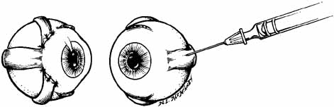 A pediatric electrocardiographic electrode is then attached to the patient's forehead, making sure that a good contact is present (see Fig. 3). It should be placed medially for the medial rectus and laterally for the lateral rectus. If not already done, the patient should be informed that an audio signal will be used during the procedure so that he or she will not become startled when the amplifier is turned on. Next, turn on the amplifier and test the connections by touching the needle tip to the conjunctiva. Any background noise should become extinguished and an audible click should be heard. If this does not happen, the ground connection to the needle hub should be checked and possible interference from overhead lights, etc., investigated. This is also the time to make sure that adequate topical anesthesia has been achieved. INJECTION TECHNIQUE Before beginning, it should be explained to the patient that he or she will have to move the eyes into various gaze positions during the procedure. Therefore, it is important that the patient keep both eyes open and fixed on some target. It is helpful to have an assistant during the injection procedure. Standing at the head of the patient, the lids are held open with the fingers. The patient should look away from the field of action of the injected muscle, for example, when injecting the medial rectus have the patient begin by looking laterally with that eye (Fig. 4). The assistant can use a hand or other fixation target for this purpose. The patient should be reminded to keep both eyes open so that fixation is maintained. With the bevel facing the muscle, the needle is inserted through the conjunctiva 8 to 10 mm from the limbus. Once through the conjunctiva, the needle is advanced several more millimeters until the tip is beyond the equator. The assistant should move the fixation target slowly to the primary position so that the injection-muscle EMG signal can be activated. If the medial rectus is being injected, continue to advance the needle straight posteriorly aiming for the optic canal (Fig. 5). When injecting the lateral rectus the syringe has to be angled toward the ear at approximately a 45-degree angle to avoid touching the periosteum of the lateral orbital wall with the needle point, which is quite uncomfortable (see Fig. 5). A slight angle is also necessary when injecting the superior rectus. The inferior rectus is often easier to inject through the lower lid rather than the conjunctiva. As the needle is advanced and while listening to the EMG signal, continue to advance until a loud crackling noise occurs. If uncertainty exists as to whether this is from the appropriate muscle, have the patient slowly look out of the field of action of the muscle to be injected. The signal should decrease. Care must be taken to ensure that slow eye movements are made. This may be somewhat difficult because the patient may be anxious or apprehensive and may experience some discomfort. When the electrode is at the appropriate location, the reconstituted toxin is injected slowly. The EMG signal should diminish at this point as the tissue is pushed away from the tip by the entering fluid. Allow the needle to remain in this position for 10 to 15 seconds and then slowly withdraw the needle. The patient should be checked for signs of hemorrhage or other potential complications. POSTINJECTION MANAGEMENT Once finished, the patient should be asked to sit up on the edge of the examination table but should not be allowed to stand until postinjection anxiety and bradycardia have subsided. Often the patient is so relieved that the process is over that an episode of lightheadedness or even syncope can occur. One to two minutes is usually all that is necessary at this time. It is not necessary to patch the eye or use antibiotics unless there is some concern about the injection process. The patient should be informed that topical anesthesia has been applied to the eye and ocular manipulation for the next 30 to 45 minutes should be discouraged. The patient should be observed for 5 to 10 minutes to make sure that no retrobulbar bleeding has occurred. Acetaminophen should suffice for any postinjection discomfort. | |||||||||||||||||||||||||