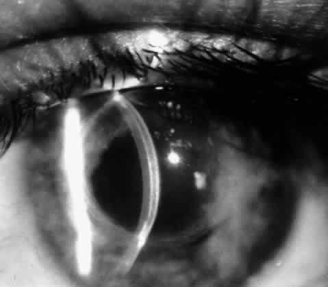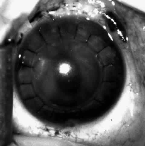 | Epikeratophakia has been used to correct aphakia in adults5 and children,6,7 as well as myopia,8 and to treat keratoconus.9 However, only epikeratophakia for pediatric aphakia is discussed here. The first pediatric patients to undergo epikeratophakia were children with unilateral congenital or traumatic cataracts who were either intolerant to contact lens wear or who were considered to be poor candidates for successful contact lens wear.10–14 Although the procedure was originally envisioned as a permanent optical correction for young children with unilateral congenital cataracts, it soon became apparent that epikeratophakia was not well suited as a first or sole solution to this problem because it could not achieve the very high power correction required for neonates and infants.15 Also, the rapid changes in refraction in the first year of life required a more flexible and easily changed optical prosthesis. For these reasons, epikeratophakia has been recommended for contact lens-intolerant, aphakic children who are 1 year of age or older. In these cases, the changes in dioptric power requirements that occur with the passage of time can be corrected with changes in spectacle overcorrection.15 Children who have traumatic cataracts with corneal lacerations are well served by this procedure because the injury often destroys the capsular support that can be used to stabilize an intraocular lens.16–18 The epikeratophakia graft provides structural support for the weakened cornea and minimizes the induced irregular and regular astigmatism, in addition to correcting the optical error (Figs. 3 AND 4).