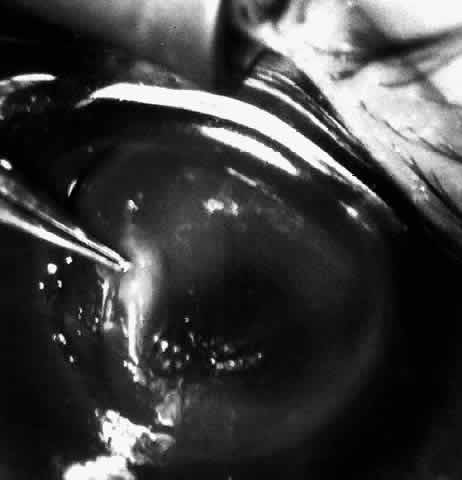 At this point, if intraocular surgery, that is, cataract extraction, pupilloplasty, or membranectomy, is to be done, it is performed through a limbal incision with a vitreous cutting instrument such as the Microvit or Ocutome (Fig. 8). The limbal incision may be closed with 8-0 polyglactin 910 (Vicryl) sutures. After the intraocular procedure is completed and before the epikeratophakia procedure is resumed, it is important to return the eye to normal pressure by injecting balanced salt solution. I prefer to accomplish this with a 30-gauge sharp paracentesis injection through clear cornea.