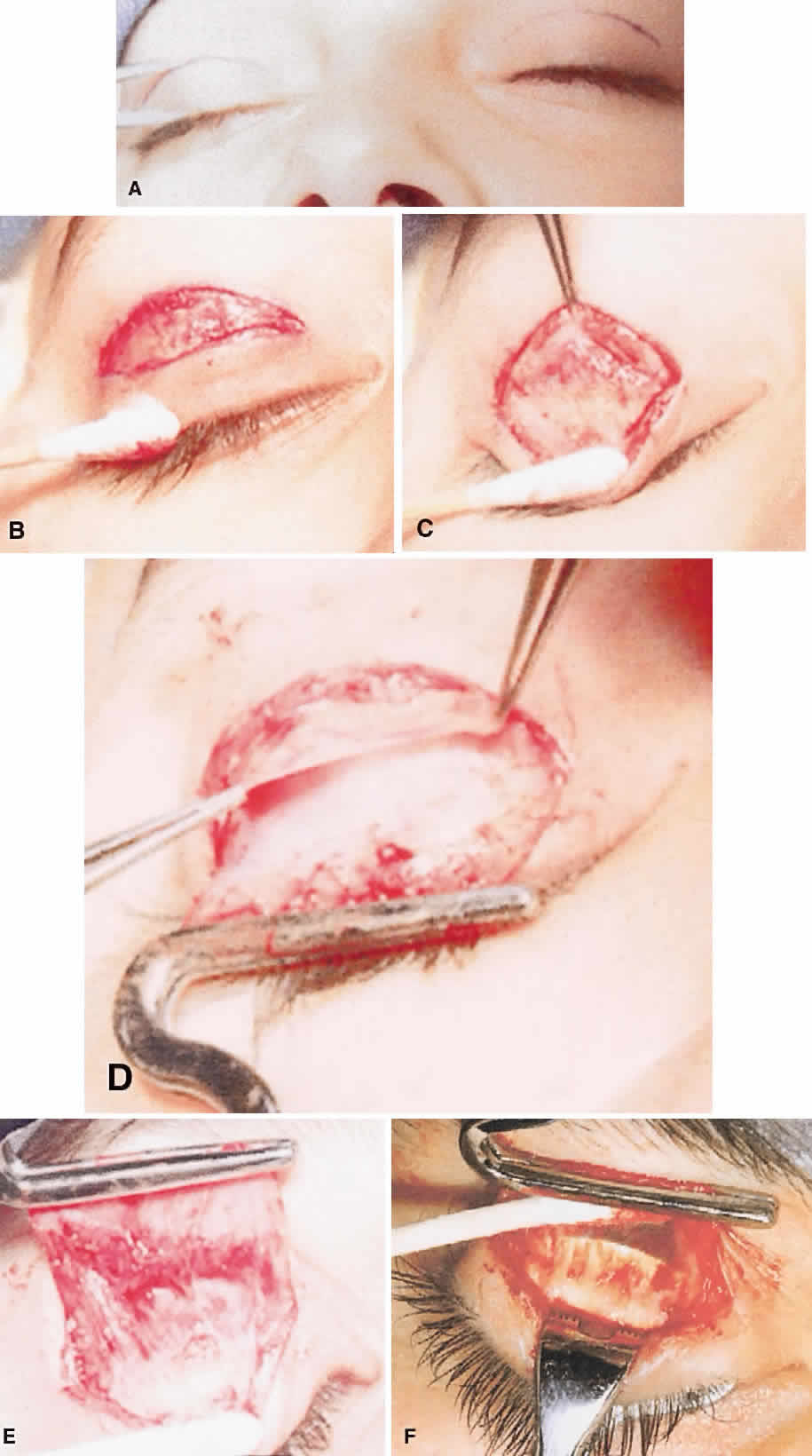 of the closed lid. The amount of levator-aponeurosis complex resected significantly differs in children with congenital blepharoptosis compared with adults with acquired blepharoptosis. In general, treatment of adult acquired blepharoptosis with the same numbers of millimeters of levator resection recommended for children would result in significant overcorrection. INDICATIONS Adequate levator function must be present to offer the ptosis patient a reasonable chance for correction with a levator resection. Many authors are in general agreement as to how much levator function is required to justify this procedure. Most suggest that a measurable lid excursion from downgaze to upgaze of 4 mm or less (measured with the ipsilateral brow inactivated with thumb or finger pressure) is too poor to permit lasting results from levator resection. If levator function is more than 4 mm but less than 6 mm, a “large” levator resection is recommended. If levator function is between 6 and 8 mm, a “moderate” levator resection is indicated. If levator function exceeds 8 mm, a smaller resection of the levator is indicated. A large levator resection is defined as 22 mm or more, moderate as 16 to 18 mm or more, and small as 13 to 15 mm. Others clinicians prefer to measure the height of the lid margin relative to the corneal light reflex or corneoscleral limbus or the width of the palpebral fissures and to use these measurements as guides to the amount of surgery to be performed.14 Lid height relative to the cornea can be measured toward completion of the surgical procedure using either Berke's recommendations or the lid margin to corneal reflex distances, thus allowing further refinement in the amount of levator aponeurosis to be resected. CONTRAINDICATIONS The external levator resection surgical technique is applicable to a patient of any age, but it is best used when levator function can be assessed accurately. As a practical guide, correction of congenital blepharoptosis with this approach is often done in the preschool age group, when the patient is 3 or 4 years old. At these ages, accurate visual acuities have been obtained, amblyopia has been identified and treated, and reliable measurements of levator function have been recorded. However, amblyopia or parental concerns often dictate earlier intervention. An external levator resection is not indicated when levator function is less than 4 mm. In such cases, immediate postoperative results might be acceptable after a large levator resection but experience has shown that the lid height will not be maintained over time. Relative contraindications to an external approach include cases in which a skin incision is undesirable, such as in the Asian eyelid. Although creation of an undesirable lid crease with an external approach can be avoided, a skin incision scar can be visible and therefore unacceptable to the patient. An alternative procedure is generally preferable. The Asian eyelid differs in several important features from that in caucasian.15 Any ptosis procedure performed in a patient with a poor Bell phenomenon, limited elevation of the eye, reduced corneal sensitivity, or poor tear production risks development of postoperative corneal complications. SURGICAL TECHNIQUE FOR EXTERNAL LEVATOR RESECTION Preoperative photographs are helpful, in that such photographs can become part of the patient's permanent record and can be referenced during the surgical procedure as desired. Used properly, these photographs can help prevent inadvertent surgery on the wrong lid and can assist the surgeon with the artistic portions of the procedure, such as lid contour and lash position. General anesthesia is required for children, but either local or general anesthesia is satisfactory for adults. Lid position may be adjusted precisely at the time of surgery if the patient is awake and only local anesthesia is used. When ptosis is bilateral, bilateral symmetric or asymmetric levator resection usually is done in one surgical procedure. If an increased risk of corneal complications exists in that patient, the procedure should be done unilaterally. If ptosis is severe but still amenable to levator resection, the surgeon may prefer to operate first on the more severely involved side. After healing has occurred and final lid position is established, surgery can then be performed on the second lid. It is generally easier to match the less ptotic lid to the more severely affected, but already corrected, lid. Existing lid creases are outlined on both lids with a fine-tipped surgical marking pencil (Fig. 4A). If the existing lid crease does not match the desirable lid crease in the fellow eyelid, a new position is marked. The marked areas are compared visually and are measured with a ruler or calipers for accuracy. In children without ptosis, the height of the center of the lid crease averages 6.5 to 7 mm from the lid margin. The nasal and temporal ends of the lid crease measure about 4.5 to 5 mm above the lid margin in children. The height of the lid crease increases with age and is about 10 mm centrally in adults. After the proposed incision site has been marked and verified, the lid to be incised is further isolated from the fellow eye with appropriate drapes. A corneal protector is inserted between the eyelids. After the anesthesiologist is informed, a solution of 1% lidocaine containing epinephrine in a concentration of 1:200,000 is injected into skin and orbicularis muscle beneath the eyelid mark. A 27 gauge needle held parallel to the lid is used for the injection. Only one or two skin punctures are required to traverse the length of the incision with a short needle. No more than 0.5 ml of solution is required, because larger volumes of fluid only distort the anatomy of the lid. If the needle tip is just beneath the skin, it is in the orbicularis layer because no subcutaneous fat exists in the lids. The lidocaine-epinephrine solution facilitates dissection and reduces 