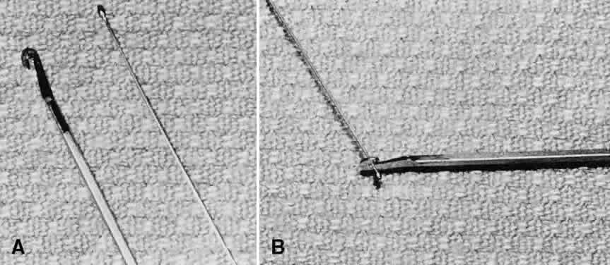 INDICATIONS Intubation of the lacrimal drainage system with a silicone tube may be useful when a probing has been performed through to the nose but the drainage system has failed to remain open.21,22 Since standard probing has such a high rate of success in resolving congenital nasolacrimal duct obstruction, intubation is necessary only occasionally. Yet, for some persistent obstructions, silicone tubes can be helpful. CONTRAINDICATIONS If it has not been possible to pass a Bowman no. 0 probe into the nose, silicone tube intubation will not be possible, and a dacryocystorhinostomy should be performed. Some uncooperative patients may not tolerate the tubing at the inner canthus and may pull it out themselves. Such patients are not good candidates for intubation. PROCEDURE It is advisable to use general anesthesia with an endotracheal tube or laryngeal mask for lacrimal intubation, since unhurried access to the nasal cavity through the anterior nares is essential. Two flexible probes with a length of silicone tubing swaged over their trailing ends (Fig. 5) are passed in turn through the lacrimal system, one through the upper and one through the lower canaliculus. The first probe passed is retrieved from the nose by grasping its end with a hook or a hemostat slid under the inferior turbinate. The probe designed by Crawford, with a small olive tip at its end, facilitates retrieval with a hook and minimizes trauma to the nasal mucosa21 (Fig. 6). Care should be taken to ensure that the silicone tube is not stripped from the end of the probe as it is drawn through the lacrimal system. The second probe then is passed and retrieved from under the inferior turbinate so that both ends of the silicone tubing, now emerging from the anterior naris, can be tied with a simple square knot in such a position that the knot retracts back into the nose when released. One version of the Crawford silicone tubing has a suture in its lumen, and the sutures (rather than the tubing) can be tied together when the tubing is trimmed to a suitable length. An alternate means of retrieving silicone tubing from the nose is offered by the Ritleng system, which uses a monofilament Prolene guide thread rather than the Crawford wire probes at the ends of the tubing.23 The Prolene guide can be hooked and brought forward as it emerges under the inferior turbinate. (A monocanalicular version of the Ritleng tube also is available.24) The intranasal portion of the silicone tubing can be fixed in place by an absorbable suture to the lateral wall of the nose,25 or it can be tied over a stent that will not pass up into the nasolacrimal duct. The silicone tubing is left in place for 3 to 4 months, during which time antibiotic solution or ointment can be used to reduce discharge and irritation. It is a good sign if tearing and discharge disappear while the tube is in place. Eventually, the tube is removed by cutting the loop between the two lacrimal puncta and pulling on one end until the knot is passed retrograde through the duct, sac, and canaliculus. Gentle tension on the tubing stretches it and thins the knot so that it passes through the canaliculus with relatively little resistance. If a stent has been used, it must be identified under the inferior turbinate and pulled out through the nose, a maneuver requiring general anesthesia in most cases.