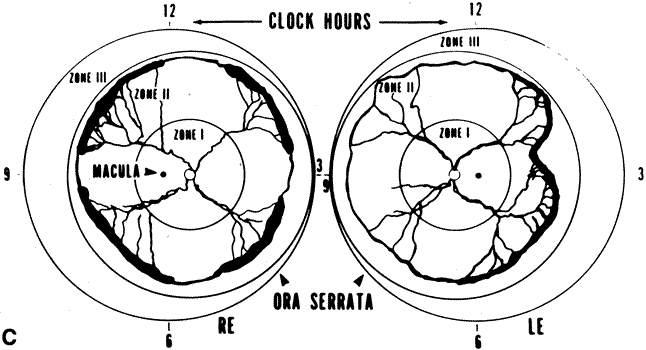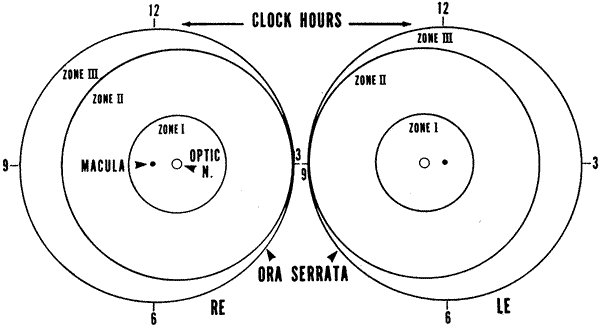 for the treatment of ROP (CryoROP study).10–13 LOCATION The retina is divided into three zones when identifying the location of ROP (Fig. 1). Zone I is a circle centered at the optic nerve with a radius of twice the distance from the optic nerve to the center of the macula. Clinically, this radius of 30 degrees approximates the diameter of field visualized with a 25D indirect lens.(14) Zone II extends from the outer edge of zone I to the nasal ora serata then forms a circle with the optic nerve at the center. Zone III is composed of the remaining crescent of retina temporal to zone II. EXTENT Extent is quantified by clock hours of retinal involvement. STAGING ROP is divided into stages of severity from stage I or demarcation line denoting minimal ROP to stage 5 or total retinal detachment (Table 1).