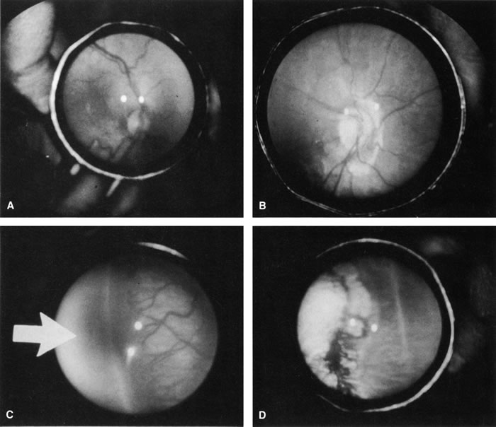 COMPLICATIONS AND THEIR MANAGEMENT Other than massive hemorrhage and infection, the most serious complication in eyes undergoing vitrectomy for advanced ROP is the formation of retinal breaks. Most retinal breaks occur anteriorly in the region of the pars plana during dissection of the tenacious epiretinal membrane. Once a retinal break is created, the case is almost certainly lost because flattening of the retina to allow for adequate cryotherapy to the break and scleral buckling is almost impossible. Reattachment did not occur in any of the cases reported by Zilis and others82 in which a retinal break was noted during surgery. Sometimes, a retinal break is not seen, but Schlieren (optical phenomenon occurring when two clear fluids of different optical densities mix) occurs. A retinal break must be assumed in those cases. Bleeding is a frequent problem during both open-sky and closed vitrectomy. Most often, eyes are operated on when the active phase of ROP has subsided. If some degree of plus disease is present at surgery, however, hemorrhage is much more likely. Intraocular diathermy usually is sufficient to stop bleeding. Blacharski and Charles93 used intravitreal thrombin to control bleeding during vitrectomy for stage 5 ROP. | ||||||||||||||||||||||||||||||||||||||||||||||||||||||||||||||||||||||
