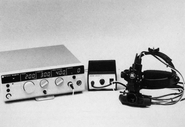 Seiberth and colleagues35 compared transscleral with transpupillary diode laser photocoagulation for the treatment of threshold ROP. They found transscleral diode laser to be as effective as transpupillary diode laser in causing regression of threshold ROP. CONTRAINDICATIONS Treatment of threshold ROP with laser photocoagulation requires clear media. Anterior segment changes, such as cataract and corneal clouding, and vitreous hemorrhage may preclude laser treatment, yet the media may be clear enough for cryotherapy to be performed. A persistent tunica vasculosa lentis may lead to cataract formation with argon laser photocoagulation.36 This risk may be decreased when using a diode laser.37 Systemic contraindications may be fewer with laser photocoagulation than with cryotherapy, perhaps due to the less invasive nature of the procedure.32 PROCEDURE Indirect laser photocoagulation for ROP should be performed with either topical anesthetic supplemented with intravenous analgesia and sedation or with general anesthesia.16 There is no need for local infiltration anesthesia because only gentle manipulation of the globe with a scleral depressor is necessary. McNamara and others30 used topical anesthesia alone, Hunter and Repka32 used topical anesthesia supplemented with systemic analgesia, whereas all infants treated by Iverson and colleagues31 and Landers and associates40 were given general anesthesia. Transient bradycardia occurred in three patients (19%) treated with laser and three (25%) treated with cryotherapy in the McNamara study. The bradycardia resolved when the scleral depressor or cryoprobe was removed for several seconds. Intubation following apnea and bradycardia was required for two patients (13%) treated with cryotherapy and none with laser in the Hunter and Repka32 study. No other systemic complications occurred. Before laser photocoagulation, the pupils are dilated. Homatropine hydrobromide 2% and phenylephrine hydrochloride 2.5% drops instilled 3, 2, and 1 hours preoperatively provide adequate dilation. If topical anesthesia supplemented with systemic analgesia and sedation is to be used, treatment can be performed in the operating room or in the nursery. Proparacaine hydrochloride 0.5% is applied to the globe. A lid speculum is placed. Gentle manipulation with a scleral depressor to position the globe for viewing of the peripheral retina is performed. Although the peripheral retina is viewed through the indirect ophthalmoscope, the laser aiming beam can be seen. When the aiming beam is in focus on the peripheral avascular retina, laser discharge is accomplished by pressing a foot pedal. Care should be taken to assure that the aiming beam is focused before discharge to avoid laser burns in unwanted areas, such as the posterior vascularized retina, cornea, iris, and lens. The entire anterior avascular retina should be treated with avoidance of laser to the active ridge. Steinmetz and Brooks38 have suggested a possible benefit to treating the ridge in addition to the avascular retina but to date no statistical benefit has been shown. Laser spots should be placed one-half burn width apart, with a dull white laser photocoagulation mark used as the endpoint. Banach and colleagues have demonstrated an increased risk of disease progression with a less dense laser photocoagulation pattern.39 For argon laser, the initial power setting should be 200 mW, with a duration of 0.1 second. The power can be increased gradually to achieve the appropriate laser mark in the fundus. For diode laser, the initial power setting should be slightly lower (150 mW), with a longer duration (0.2 second), to avoid causing choroidal hemorrhage and rupture of Bruch's membrane. A neonatologist or anesthesiologist should monitor the infant during treatment. The advent of portable diode (Fig. 5) and argon lasers has simplified the treatment of ROP and has largely supplanted cryotherapy as the treatment of choice for ROP at most centers. The portable laser can be brought directly into the nursery, which avoids the need for costly and sometimes hazardous transfer of the infant to a facility with a freestanding laser. For safety reasons, treatment should be performed in an isolated room in the nursery.