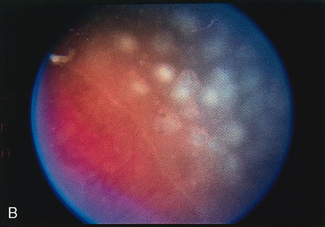 A reduction in both plus disease and extraretinal fibrovascular proliferation should be seen by 1 week after treatment. COMPLICATIONS AND THEIR MANAGEMENT Both ocular and systemic complications may occur during cryotherapy for ROP. Systemic complications may be life threatening. All patients treated with cryotherapy have periorbital edema, conjunctival injection, and chemosis. The periorbital edema usually subsides in a few days, whereas the conjunctival injection and chemosis take 1 to 2 weeks to regress. In the CryoROP study, conjunctival or subconjunctival hematoma occurred in 11.7% of treated eyes, and unintended conjunctival laceration occurred in 5.3% of eyes.18 These complications are self-limited and do not lead to long-term problems. The most frequent and most serious ocular complication in the CryoROP study was intraocular hemorrhage. Retinal, preretinal, and vitreous hemorrhage occurred in 22.3% of treated eyes.18 At times intraocular hemorrhage may prevent the completion of treatment. In such cases, treatment is aborted and the eye is carefully followed for clearing of the hemorrhage so that treatment may be completed. Because treatment is delivered with a probe that must be pressed onto the globe, there is the potential for severe injury, such as perforation of the globe, eye muscle laceration or avulsion, and orbital wall injury. Central retinal artery occlusion may occur as a result of excessive pressure placed on the globe during cryotherapy. In the CryoROP study, transient closure of the central retinal artery occurred in one case.18 Care should be taken to limit the pressure that is placed on the globe and adnexal structures. In the CryoROP study,18 9.4% of infants had bradycardia, arrhythmia, or significant apnea during the administration of anesthesia and cryotherapy. An additional 1.1% of infants had acquired or increased cyanosis. One infant had a seizure during treatment. Brown and others17 reported three cases of respiratory arrest and one of cardiopulmonary arrest in 80 consecutive infants treated with cryotherapy for ROP. These severe systemic complications underscore the need for careful monitoring of infants by a neonatologist or anesthesiologist during treatment. Evidence has shown that the addition of appropriate systemic anesthesia to topical anesthesia for cryotherapy can reduce the rate of systemic complications.16 Late-onset retinal detachment after cryotherapy has been reported.20 Breaks are often found at the border of the cryotherapy-treated and untreated retina. The retinal breaks may occur as a result of the inability of treated retina to stretch as the eye grows or as a result of vitreous traction.21 Surgical treatment includes standard buckling, vitrectomy, or combination techniques although the need for subsequent surgery is as high as 30%.22 An increased risk of rhegmatogenous retinal detachment is present for life. The incidence of myopia is increased in children with a history of ROP with or without treatment. This increased risk of myopia correlates directly with severity of eye disease. Severe ROP leads more often to high myopia.23 When compared with observed control eyes with threshold ROP, eyes treated with cryotherapy have an increased risk of myopia greater than 8.00 Diopters (D).24 The visual field in eyes with a history of threshold ROP is decreased when compared with normal controls. Results from the CryoROP study at 10 years demonstrated a reduction in visual field area from 30% to 37% in eyes treated with cryotherapy when compared with healthy controls.25 This reduction in visual field was 5% greater for eyes that underwent cryotherapy than in eyes with threshold ROP that did not undergo cryotherapy. There does not appear to be an increased incidence of amblyopia in eyes with threshold ROP treated with cryotherapy when compared to observed threshold ROP. In the CryoROP study, strabismus surgery was required for 10% of eyes treated with cryotherapy and 7% of control eyes with threshold ROP.26 |