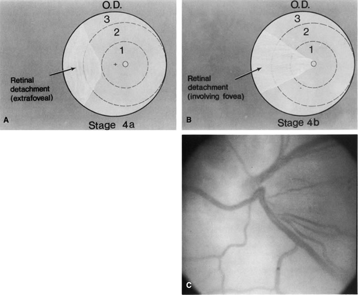 INDICATIONS Cryotherapy and laser photocoagulation do not cure all cases of threshold ROP. Progression to stage 4 or 5 disease may occur, despite appropriate treatment. These more advanced stages represent retinal detachments that range from small and localized to closed anterior and posterior funnel detachtments.60 Retinal detachments in ROP may have a serous and tractional component. Exuberant extraretinal fibrovascular proliferation may lead to subretinal serous fluid accumulation. With progressive fibrous proliferation, tractional detachment of the retina may occur. This proliferation is often circumferential, and the retina may detach in a purse string configuration. Rhegmatogenous retinal detachments do occur but are rare, often occurring years later as a delayed complication of vitreoretinal traction to an abnormal retinal periphery.20,22 The indications for scleral buckling surgery are stage 4A with progression, stage 4B or open funnel stage 5 retinal detachment. Stage 4A retinal detachment (Fig. 7A) is subtotal, and spares the fovea. The CryoROP study demonstrated resolution in 46.1% of eyes with stage 4A retinal detachments at 4½ years. 61 Unfortunately, the study also showed a 17.9% risk of progression for stage 4A eyes to total retinal detachment. Stage 4B retinal detachment (Fig. 7B), which is due to progressive exudation or traction, involves detachment of the fovea. Stage 5 retinal detachment (Fig. 7C) is total; it may have an open or closed funnel configuration. When the detachment is funnel shaped, the funnel is divided into anterior and posterior parts, and may be open or closed in either location.