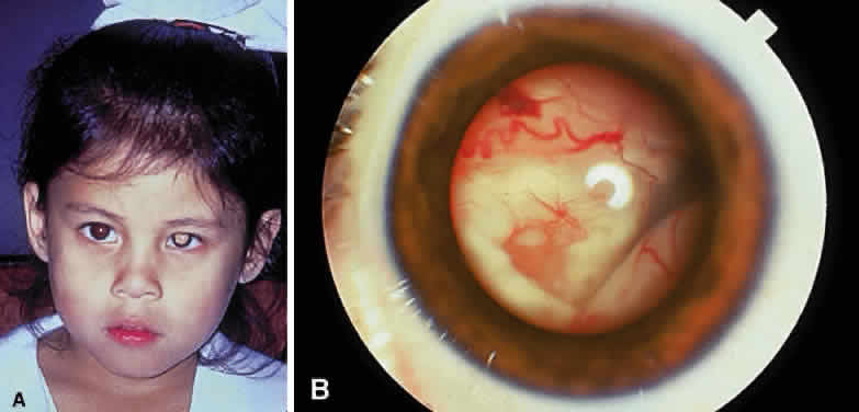 experience. If the tumor is unilateral and large, enucleation or chemoreduction plus adjuvant focal treatments are options. If the histopathologic findings in the enucleated eye show no sign of optic nerve or choroidal invasion, then systemic chemotherapy is not provided. However, if the histopathologic study reveals choroidal or optic nerve invasion,53,54 suggesting a poor prognosis, then chemotherapy is advised. If there is extensive invasion of the optic nerve or orbital involvement, then supplementary chemotherapy and irradiation to the anophthalmic socket are indicated.55 Usually, 3500 to 4000 cGy in divided doses over a 4 to 6 weeks is adequate. In bilateral cases in which attempts are being made to save the remaining eye, combined treatment may be more complex. After chemoreduction, external beam radiotherapy, or scleral plaque irradiation, a tumor may remain viable, as suggested by persistent dilated retinal blood vessels feeding the tumor or enlarging mass. Supplementary photocoagulation, thermotherapy, or repeat plaque radiotherapy may be necessary in such cases to eradicate the residual viable tumor. If the tumor recurs as a small growth near the ora serrata, supplementary transcleral thermotherapy or freeze-thaw cryotherapy may be used. If such a peripheral recurrence is greater than 3 mm in elevation and has vitreous seeding, a supplementary radioactive plaque may be applied. |