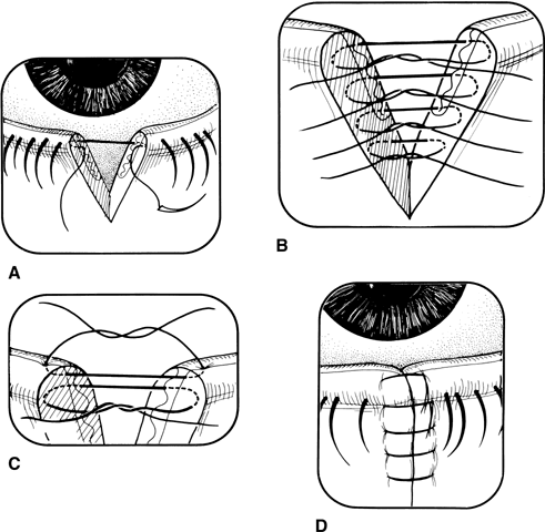 be arranged. If one is certain that the lacrimal system is not involved, the physician must use judgment to determine whether the child could tolerate repair in the emergency department. If anesthesia is required, it is wise to remember that a delay of even 48 to 72 hours is well tolerated. The eyelid has excellent blood supply, and this delay does not compromise the healing process. Therefore, if the child has eaten recently, one must not declare the case an emergency. It is best to wait until the conditions are more favorable. The child is placed on antibiotics and the repair is scheduled. The first step is to clean the wound well. This should be done with minimal disruption to the surrounding tissue. When there are a large number of foreign particles, one should first try to irrigate the material from the wound. The next step should be the removal of individual particles with the use of fine forceps. Scrubbing tends to destroy the tissue and make repair more difficult. It is usually not necessary to debride or “freshen” the wound edges. The more tissue left to close the wound, the more favorable the results. In a situation in which tissue has already been lost due to the injury, one should not consider primary grafts unless the extent of the injury threatens the integrity of the cornea. Major reconstruction should be delayed for 6 to 9 months. |