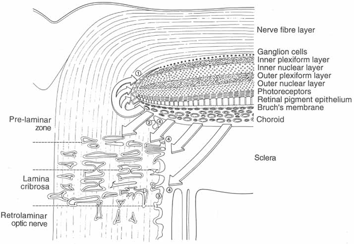 and the prelaminar, laminar, and retrolaminar portions of the nerve. The intraocular portion lies within the limits of the posterior sclera and measures approximately 1 mm in length (Fig. 23). The internal surface is in contact with the vitreous. When viewed on the retina, it is termed the optic disc. It is somewhat larger in males than in females and in blacks than in whites.155 The surface area of the disc averages 2.34 ± 0.47 mm2.156,157 In one study, age and gender had no significant effect on disc size; however, myopic discs were found to be larger than hypermetropic discs.156 The disc is pale pink and may be round or slightly oval. Its horizontal diameter averages 1.75 ± 0.19 mm, whereas its vertical diameter averages 1.8 ± 0.21 mm.1 The center of the optic disc is approximately 4 mm medial and 0.8 to 1 mm superior to the foveola.158 It is 27 mm from the nasal limbus and 31 mm from the temporal limbus. The optic nerve pierces the sclera approximately 3 mm medial and 1 mm inferior to the posterior pole of the globe. Ophthalmoscopically, the appearance of the optic disc depends on several factors, including the termination of the surrounding retinal and choroidal layers, the degree at which the nerve enters the scleral canal and leaves the globe, the size of the globe, the shape, size, and orientation of the scleral canal, the branching of the vessels at its surface, the glial tissue within the nerve head, the size of the optic cup, and the number of nerve fibers present in the nerve head.159 Generally, the termination of the retinal layers occurs in an oblique fashion so that the inner layers end before the outer layers. This shelving of the retinal layers is more prominent nasally than temporally, where the termination of the retinal layers may be vertical. When the retinal pigment epithelium and retina terminate before reaching the optic disc, a choroid crescent is visible. If the retinal and choroidal layers terminate before reaching the optic disc, a scleral crescent is visible. When the pigment epithelium is folded or prominent, a pigment crescent may be visible. The optic disc may appear tilted if the optic nerve exits at a more oblique angle, as is often the case in axial myopia. The central portion of the optic disc contains the central retinal artery and vein.160–162 The central retinal artery is a branch of the ophthalmic artery. The central retinal vein drains into both the cavernous sinus and the superior ophthalmic vein. In general, these vessels are present on the nasal side of the optic cup and disc and divide on the surface of the disc into superior and inferior branches, which further divide into nasal and temporal branches. Rarely, the branching of these vessels may appear to occur within the substance of the nerve so that only their branches and not their main trunks are visible within the optic cup. The nerve head is surrounded by a mound of unmyelinated nerve axons as they converge into the optic disc. This convergence of the nerve fiber layer is called the papilla and varies in height depending on the amount of glial tissue present, the branching of the retinal vessels, and the size of the optic disc and cup.163 Although nerves in the intraocular portion are unmyelinated, a thin layer of astrocytes associated peripherally with processes from Müller cells is present (the inner limiting membrane of Elschnig). Centrally, this membrane may be quite thickened, forming what is called the central meniscus of Kuhnt. At the disc margin, the retinal axons bend sharply over the edge of the disc. The axons in this area become segregated as bundles by neuroglial cells oriented at right angles to the fascicles. The astrocytes present in the disc form a three-dimensional basket-like network.163 Surrounding the nerve and separating it from the retina and choroid is the circular intermediate glial tissue of Kuhnt. The laminar portion of the optic nerve head consists of retinal ganglion cell axons and central retinal vessels that pass through a porous connective tissue region of the posterior sclera, called the lamina cribrosa.164 The lamina cribrosa forms a scaffolding for the optic nerve axons and serves to anchor the axons to each other and to the sides of the optic nerve canal.165–168 The lamina is formed by collagen and elastic tissue from the inner one-third of the sclera. This tissue extends across the optic nerve canal to form a sieve-like membrane through which the optic nerve fascicles pass. Pores are significantly larger in the superior and inferior quadrants than in the nasal and temporal quadrants, and the differences are more pronounced for peripheral regions compared to central regions.168 The anterior portion of the lamina is concave with the concavity facing anteriorly.16,163 The lamina cribrosa terminates posteriorly at the point where the initial septae of the optic nerve are formed by pial tissue. As in the prelaminar portion of the optic nerve, astrocytes surround the axonal bundles, separating them from the connective tissue of the lamina cribrosa and the vessels within the nerve. Glial tissue surrounds the nerve, and outside this glial tissue is a connective tissue layer of Elschnig. Posterior to the lamina cribosa lies the retrolaminal optic nerve, which represents a transition zone from the optic nerve head to the orbital portion of the nerve. The nerve axons in this area become myelinated. Pial septae originating from the posterior surface of the lamina cribrosa surround the nerve fascicles as they leave the lamina. As the nerve leaves the sclera, it becomes surrounded by a connective tissue sheath that externally is continuous with the sclera and represents the dura overlying the arachnoid and pial tissues. The subarachnoid and subdural spaces end blindly at the point where the optic nerve exits the sclera. The scleral canal is usually conical in shape, being narrower internally than externally. However, it may also be cylindrical and, rarely, 