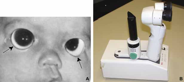 if there is any family history of congenital disease. There will be some instances in which an examination under anesthesia is required; however, this should be used as a last resort given the cost in added time and use of an operating suite. One useful method for an infant ocular examination is to instruct the parents to keep their child hungry before the visit. This will allow feeding to serve as a distraction and assist in keeping the child quiet during the examination. Another useful technique in maintaining comfort for the infant is to perform as much of the examination as possible with the child in the parent's lap, having the parent handle and position the child when needed. Once calm and in position, instill topical anesthetic and place either a lid speculum or Koeppe lens to begin the examination (Fig. 1A). Instruments used in the evaluation of neonatal corneal abnormalities are listed in Table 1.