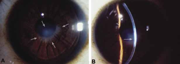 A-scan ultrasonography can be used to distinguish simple megalocornea from anterior megalophthalmos and buphthalmos. Only the anterior chamber will be enlarged in anterior megalophthalmos, whereas the entire globe will be enlarged in buphthalmos. Keratoglobus is a condition in which there is generalized thinning of the cornea, which may appear to be enlarged clinically but is usually normal in diameter. SIMPLE MEGALOCORNEA These individuals present with bilateral clear corneas of normal thickness measuring greater than 12.5 mm in diameter. This condition is not progressive and there are no associated ocular or developmental abnormalities.15 In the few pedigrees reported, this condition may possess autosomal-dominant inheritance.16 Management is similar to anterior megalophthalmos discussed later. There is no treatment for this condition except for the correction of any refractive error and reassurance to the family that eye can function normally. Histopathologically, the anterior chamber is normal except for an enlarged cornea, and there are no abnormalities of the posterior segment.15 ANTERIOR MEGALOPHTHALMOS Megalocornea most commonly presents as anterior megalophthalmos, in which there is abnormal development of other anterior segment structures in addition to the cornea (Fig. 3).17 The cornea is clear with normal curvature and thickness; however, some affected corneas may develop a central mosaic stromal opacity.18 The anterior chamber appears deep from either the steep arc of the enlarged cornea or secondary to lens subluxation and iridodonesis. Other notable features of anterior megalophthalmos include anterior iris stromal hypoplasia, peripheral full-thickness iris holes, and Krukenberg's spindle and pigment dispersion with iris transillumination defects (Fig. 3B). Dilator muscle atrophy can lead to miotic pupils.17
