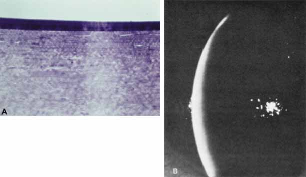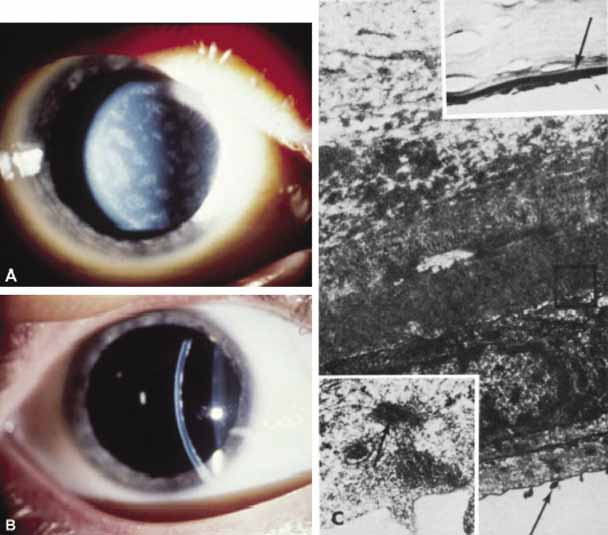 the tear. Acute ocular birth trauma is being seen less often by ophthalmologists because of improved prenatal care and elective cesarian section reducing the rate of complicated forceps deliveries (Fig. 8A). Ocular trauma from forceps is thought to occur when the forceps blade slides over the inferior orbital rim, compressing the globe against the superior orbit and stretching the cornea horizontally.65 Because the cornea is being compressed horizontally, these tears will line up in a vertical or oblique pattern (Fig. 8B). Other clinical findings associated with ocular birth trauma include ipsilateral periorbital edema and ecchymosis. Corneal edema is the most common presenting sign of infantile glaucoma when it presents in the first 5 days of life, being present in 80% of cases.66 By 6 months of age, approximately 75% of affected infants will manifest the corneal enlargement and buphthalmos characteristic of infantile glaucoma.66 The tears in Descemet's membrane caused by infantile glaucoma have a more random distribution, often circumferential to the limbus and sometimes extending sinuously toward the center of the cornea. Clinical features such as a delay in presentation of corneal edema, patterns of Descemet's tears, and associated ocular findings help to clearly distinguish ocular birth trauma from infantile glaucoma. When Descemet's membrane tears, it retracts more in the center leaving a dehiscence with roughly parallel edges.67 The stroma and epithelium overlying this tear will become diffusely edematous. Along the margin of the tear, Descemet's membrane will often curl toward the stroma like a watch spring. Clinically, this curl forms a refractile edge evident under retroillumination through the corneal edema. It is important not to mistake these prominent edges for the tear itself, which is actually the space between these edges. To perform a complete anterior segment evaluation, it may be necessary to remove the edematous epithelium with a moist cotton swab. The corneal edema should resolve within weeks to months, provided the birth trauma was not too severe and that the intraocular pressure was surgically lowered in cases of infantile glaucoma. With time, a fresh endothelium will resurface the posterior cornea and synthesize a new basement membrane, filling the dehiscence and accentuating the edges of the tear. After the corneal edema resolves, the edges of the break will appear as rounded, glassy ridges protruding from the posterior cornea readily apparent under retroillumination. In some instances, one edge of the tear may separate from the stroma and hang into the anterior chamber as a falciform ledge, with its free edge curling anterior to form a scroll (Fig. 9). When two tears occur parallel to each other, the edge of Descemet's membrane between the tears may curl toward each other. This strip of Descemet's may then disassociate from the overlying stroma, resulting in a glassy strand across the concavity of the posterior cornea. In this circumstance, the newly laid basement membrane will have a beaten-metal, guttate appearance. Histopathologically, the edge of a Descemet tear curls toward the stroma, possibly because of the differential elasticity between the anterior banded and posterior nonbanded layers within Descemet's membrane.67 As the new regenerating endothelium spreads over the edge, it encases the original coiled Descemet's membrane in a thick multilaminar periodic acid-Schiff (PAS)-positive basement membrane (Fig. 9). This new basement membrane forms the clinically evident refractile edge. Within the bed of the tear, the regenerating endothelium lays down an irregular basement membrane with focal excrescences that produce the beaten-metal appearance. Ultrastructural studies of the cornea in human congenital glaucoma are rare,68 but the ultrastructure in rabbits with spontaneous buphthalmos has been described in detail.69 Intraepithelial and subepithelial edema is present, accounting for the ease with which one can remove the epithelium clinically. Stromal edema, loss of regular collagen architecture, and the degree of scarring correlate with the degree of corneal opacity and thickness. In rabbits with mild to moderate corneal clouding, Descemet's membrane is thicker than normal and manifests the compact structure typical of basement membrane. In rabbits with more severe corneal opacification, a layer of small-diameter collagen fibrils enmeshed in amorphous material appears posterior to Descemet's membrane. In these rabbits, no tears in Descemet's membrane are observed clinically or histopathologically, suggesting that corneal edema may occur from elevated intraocular pressure alone. The thin endothelial cells can be as large as four times their normal size and contain cytoplasmic vacuoles appearing as small pits on scanning electron microscopy. In humans, these enlarged endothelial cells may represent the ones that decompensate later to produce corneal edema. Recently, in vivo confocal microscopy has been used to further evaluate Descemet's tears and endothelial changes associated with congenital glaucoma.70 Key findings include a mild reduction of keratocyte density in the middle and posterior stroma, along with the presence of discontinuous hyperreflective structures overhanging the endothelial layer at the level of Descemet's membrane. Additional confocal analysis of the endothelial layer demonstrate a low cell count, focal cellular lesions, severe polymegethism, and pleomorphism.70 Treatment is generally not necessary for patients with ocular forceps injury. The corneal edema will usually resolve within weeks. Corneal astigmatism may result from this injury and will require early refraction and patching to prevent amblypoia.65 In some instances, the edema may persist and form an opacification, which may require penetrating keratoplasty. In this circumstance, the visual prognosis is poor in the affected eye. Young children with infantile glaucoma may requir