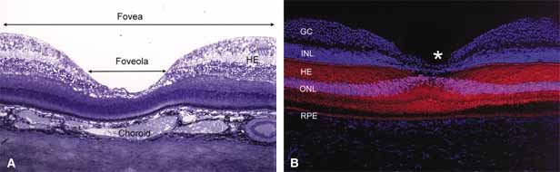 FOVEA In the region of the anatomic fovea, the retinal layers have a unique arrangement specialized for color vision and better visual acuity than in the remainder of the retina. The entire fovea measures 1.5 mm in diameter and contains 10% of the cones. It has the highest cone density in the retina, approximately 147,300 per square millimeter.12 The central 0.40-mm zone is free of capillaries and is nourished by the choriocapillaris circulation.13 Clinically, this region is referred to as the foveal avascular zone and can be readily visualized on fluorescein angiography (Fig. 6). In the center of the fovea is a specialized structure 0.33 mm in width, the foveal pit or foveola (Fig. 7).13 This central-most region is free of rods and blue cones (Fig. 8). The red and green cones in this region are oriented parallel to each other and are perfectly straight and vertical with respect to the retinal surface to allow the greatest light sensitivity. The inner segments of these cones are separated from each other by Müller cells.14 In addition, the foveal cones differ from cones elsewhere in the retina. They are long and slender like rods, measuring approximately 80 μm in height. In addition, these cones have a large nucleus and lack the dense collection of mitochondria seen in the ellipsoid of most photoreceptors. To minimize the light scatter through the tissue overlying the cones, the inner central fovea is composed only of processes of the Müller cells. It lacks the inner nuclear layer, inner plexiform layer, ganglion cells, and the nerve fiber layer. In addition, the external plexiform layer has a unique configuration in the anatomic fovea. The external cone fibers (axons) at the foveola make an almost right angle turn away from the foveola and assume a course parallel to the surface of the retina. From the parafoveolar region to the edge of the anatomic fovea, the fibers of the remaining cones and of the rods pursue a similar course. The aggregate of all these horizontally arranged fibers forms Henle's layer of the anatomic fovea or clinical macula (Fig. 7B). After a short course parallel to the retinal surface, these fibers become perpendicular to the retinal surface to synapse with the dendrites of the overlying bipolar cells. This first synapse between the photoreceptors and bipolar cells of the fovea occurs outside the central 0.2-mm diameter of the foveola.14 Clinically, this region has a yellow discoloration on funduscopy because of the presence of xanthophyll in the ganglion and bipolar cells. This macular pigment has several proposed functions, including prevention of chromatic aberration at the fovea, selective absorption of potentially toxic blue light, and quenching of various active oxygen species.15 In the human retina, two components of the macular pigment have been identified.16 They are zeaxanthin and lutein, two structural isomers of dihydroxyxanthophyll. In general, zeaxanthin is confined mostly to the foveal region, whereas lutein is found more widely distributed in the posterior pole. Studies on the monkey retina suggest that a particular ratio of these two xanthophylls may be associated with a specific cone subtype.17 Among patients with age-related macular degeneration, decreased levels of these pigments have been noted in the macula.18 Because these pigments are potent antioxidants, they may play an important role in maintaining the health of the retinal cells in the macula during aging. In animal models, they have been shown to protect photoreceptors from light-induced apoptosis.19 PARAFOVEA The parafovea, defined as the 0.5-mm-wide annular zone surrounding the fovea (for a total diameter of 2.5 mm), has the largest accumulation of neurons in the entire retina. The bulk of these cells are in the ganglion and inner nuclear layers. This is also the region where the outer plexiform layer forms the thickened Henle's layer by the multitudinous axons of the foveola photoreceptors (see Fig. 7A). This region has a lower density of cones than at the foveolar center. There are approximately 100 cones per 100 μm, and the cone inner segments are separated from each other by 1 to 3 μm.14 The rods also begin to appear in this region, and toward the peripheral edge of this parafoveal zone the outer nuclear layer becomes filled mostly with rod nuclei. Immediately temporal to the papilla, the parafovea contains the highest rod density, 170,000 per square millimeter.12 The inner nuclear layer here is also very dense and consists of up to 12 rows of cells. Similarly, the ganglion cell layer forms up to seven rows of closely packed cells at the foveal edge. The nerve fiber layer is thickest in the region of the papillomacular bundle nasal to the fovea and is thinner temporal to the fovea. PERIFOVEAL REGION The perifoveal region is the outermost ring of the anatomic area centralis. It starts at the point where the ganglion cell layer has four rows of nuclei and ends peripherally where the ganglion cell layer is reduced to the single-cell layer, typical of the peripheral retina. Funduscopically, the perifovea includes the circular area 1.25 to 2.75 mm from the foveolar pit. It defines the periphery of the clinical macula, which has a horizontal diameter of 5.5 mm and corresponds to a visual field of 18.3 degrees. The perifovea differs from the parafovea in that it has a less densely packed array of cone outer segments. The rod density is increased to an average of two rods between adjoining cones. The outer nuclear layer of the perifoveal zone, similar to that of the peripheral parafovea, contains the maximum density of rods. However, the outer plexiform layer and the inner nuclear layer are reduced in thickness in this zone compared with those of the parafoveal zone. This is because the perifoveal outer plexiform layer does not carry the axons of the cones in the foveola. The inner plexiform layer also is reduced to six or seven rows of nuclei as the bipolar cell density decreases a