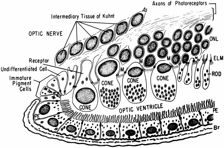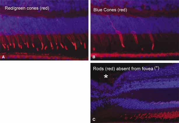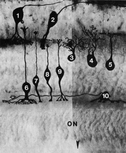 Data from Boycott BB, Dowling JE: Philos Trans R Soc Lond, Ser B No. 799, 225:109, 1969; Kolb H, Famiglietti EV: Invest Ophthalmol Vis Sci 15:935, 1976; and Gouras P, Zrenner E: Color vision: A review from a neurophysiological perspective. In Autrum H, Ottoson D, Perl ER, Schmidt RF (eds): Progress in Sensory Physiology, Vol 1. Berlin: Springer-Verlag, 1981.