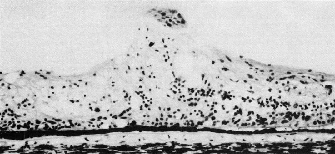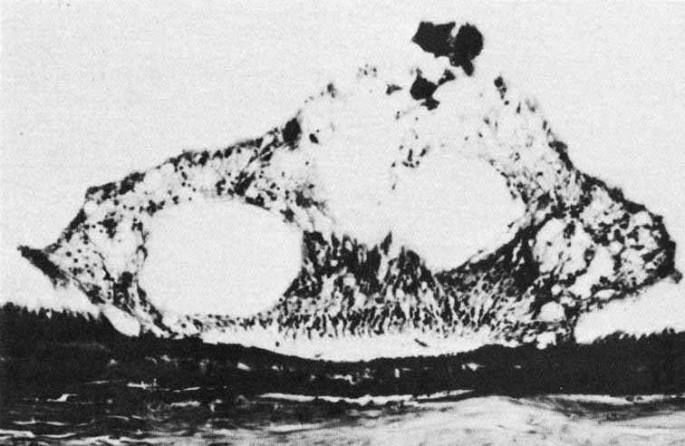 The Müller cell forms tight junctions with other Müller cells and with neural cells.196 On the outer side of the retina, a continuous row of zonulae adherentes formed by the Müller cells is the external limiting membrane.195 This row of junctions provides a barrier to the passage of metabolites in and out of the retina. The Müller cell cytoplasm shows evidence of topographic specialization.194 The cytoplasm toward the inner half of the cells is denser than that of the outer half and contains the machinery for protein synthesis, patches of radially oriented filaments, and small dense particles (Fig. 39). Radioactive tracer studies demonstrated that glycogen and protein synthesis is highest in this region.197 The outer half of the cytoplasm contains a high concentration of mitochondria, microtubules, and glycogen. This part of the cell is believed to participate in absorption and intracellular transport. Numerous microvilli are seen in the outer half extending beyond the external limiting membrane; they may be involved in an exchange of metabolites with the pigment epithelium and in maintaining a homeostatic environment in the region of the photoreceptor outer segment. Potassium released into the extracellular space with neuronal activity is removed from the outer retina, probably by an active pump in the microvilli of Müller cells.195 Nuclei of Müller cells have eccentric nucleoli and are positioned in the inner nuclear layer of the retina.198 The soma of these cells, however, can be distinguished from that of the other cells within the same layer by the microscopic appearance of a dense cytoplasm resulting from the large content of ribosomes and endoplasmic reticulum. In fact, the metabolic synthetic machinery in Müller cells is more highly developed than in any other cell in the eye, except that in the pigment epithelial cell. Recent studies in cultured Müller cells show that these cells can synthesize retinoic acid and may be a source of retinoic acid in the retina.199,200 In addition, the Müller cell has also been found to be the only human retinal cell that contains cellular retinol- and retinaldehyde-binding proteins.201,202 This implies that the Müller cell may play an important role in local metabolism and processing of the visual pigment. Thus, disease processes seen clinically that affect Müller cells would result in both metabolic and structural changes in the entire retina. Müller cell dysfunction may be the basis for progressive retinal disintegration of all the retinal layers in clinical entities such as senile and X-linked juvenile retinoschisis.193,203 Recently, Gass described a cone-shaped zone of Muller cells that composes the central and inner part of the fovea centralis. These cells were hypothesized to act as a repository for xanthophylls and may play a role in the pathogenesis of macular disease, e.g. macular hole and foveomacular schisis.204 ASTROCYTES Although the Müller cells constitute the majority of retinal glial cells, the astrocytes (astroglia) are widely dispersed between the vasculature and the neurons (Fig. 40). On the basis of the morphologic and cytoplasmic features of these cells, they can be classified into fibrous astrocytes, protoplasmic astrocytes, and lemmocytes,194,205,206 The fibrous astrocyte is a branched cell that adheres to the walls of the larger retinal arteries. Viewed by electron microscopy, these cells have a homogeneous cytoplasm with a dense round-to-oval nucleus that may be flattened on the surface next to a large blood vessel. The thin layer of cytoplasm has a smooth and granular endoplasmic reticulum, vesicles, and a few mitochondria.193 The Golgi apparatus is located in one of the cellular processes that clasp the wall of the blood vessels and reach into the nerve fiber layer where they embrace a large number of axons. These processes and cell bodies have their cytoplasm filled with fine fibrils approximately 10 nm in diameter. The nuclei of astrocytes, unlike those of Müller cells, are located in the nerve fiber layer. The protoplasmic astrocyte is distinguished from the fibrous astrocyte by its fewer and thicker branches. These cells have coarse nuclear chromatin granules and irregularly shaped nuclei surrounded by a clear cytoplasm containing only a few fibrils.194,205 These astrocytes have their nuclei some distance away from the adventitia of vessels to which they are attached. Both protoplasmic and fibrous astrocytes produce a basement membrane that juxtaposes their plasma membrane with the adventitia of the vessels they surround. The third type of astrocyte is a long, thin, bipolar glial cell that resembles bipolar astrocytes of the central nervous system.207,208 In the retina, this cell has long, slim processes that traverse the retina within nerve fiber bundles, but it has not been observed to make contact with blood vessels.195 Astrocytes are characterized by prominent cytoplasmic fibrils and the formation of pedicles at the surfaces of blood vessels on electron microscopy studies.183 They have a sparse endoplasmic reticulum and are electron-dense. They contain a noticeable concentration of glycogen granules, elongated mitochondria, microtubules, a cilium, and an occasional centriole. Their processes appear to have punctate adhesions or “gap” junctions between them. The major distinguishing feature between the two major types of astrocytes is their difference in shape and amount of cytoplasmic fibrils. The protoplasmic astrocytes are more rounded and have fewer cytoplasmic fibrils than the fibrous astrocytes. Within the ganglion cell layer, the astrocytes tend to lie horizontally. Their slender processes form an interconnected honeycomb-like scaffolding between vessels and neural cells that is parallel to the internal limiting membrane and perpendicular to the Müller fibers. The astrocytic cell bodies are located in the inner plexiform layer and send processes that reach as far as the inner nuclear laye