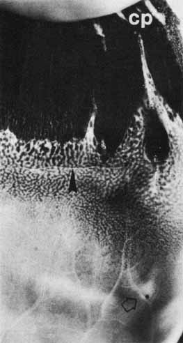 in function. The synaptic junction of a typical chemical synapse consists of specialized apposed membranes of the two neuronal cells, separated by a 20- to 30-mm cleft.45 Similar to other intercellular junctions, such as zonulae adherentes, the plasma membrane of the synaptic junction contains tufts of fine filaments that insert into cytoplasmic densities, and the two apposing cell membranes are glued together by a thin, dark plate of filamentous material in the intercellular cleft.46 However, unlike the interepithelial cell adherence, the interneuronal synapse is polarized and has an asymmetric predominance of intracytoplasmic fibrils in the postsynaptic side of the junction. The distinction between the morphology of the synaptic junction and that of the zonula adherens is important because both types of junctions are present between neuronal cells in the retina. These nonsynaptic junctions do not serve the purpose of electrical communication between cells. As in epithelial tissue, where they are commonly found, the zonulae adherentes act as binding sites to maintain tissue cohesion.45 In neural tissue they are usually short and have been given the special label puncta adhaerentia.46 Another type of junction between neuronal cells in the retina is the gap junction.47 In a gap junction, there is close apposition between presynaptic and postsynaptic membranes, and current is allowed to pass directly between adjacent cells. Thus, it is classified as an electrical synapse. Because no chemical mediator substance is involved, the rate of signal transmission is faster in these junctions than in typical chemical synapses. In some synapses, characteristics of both the chemical synapse and the gap junction are found. These connections, called “mixed synapses,” have not been found in the retina thus far.45 The electrical synapse (gap junction) characteristically shows a transsynaptic gap with a seven-layered structure produced by the approximation of membranes from the two juxtaposed cells (Fig. 19).48 The synapse consists of four dense lines and three intervening light spaces. It lacks the morphologic detail characteristic of the chemical synapse. Thus, they are localized best by tracer coupling. There are no vesicles and no obvious changes in the cytoplasm on the two sides of the junction. The gap junction does not function by the use of a chemical transmitter. Instead, it offers a low-resistance pathway between the cells. The extent of the electrical coupling of the adjacent cells appears to be dependent on the level of expression and type of the connecting particles (connexin). Thus, plasticity of the coupling in the retina is possible and the retina has the potential to optimize vision for the ambient lighting conditions.49