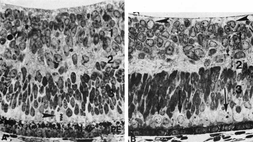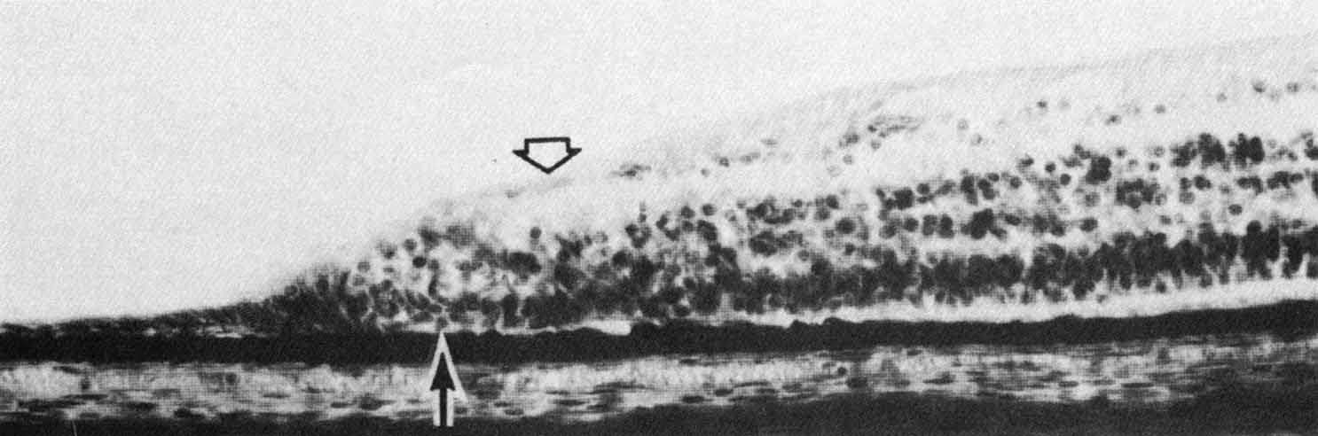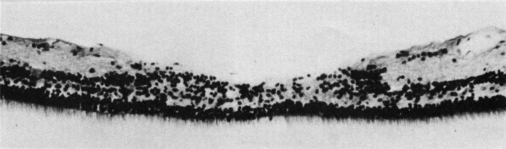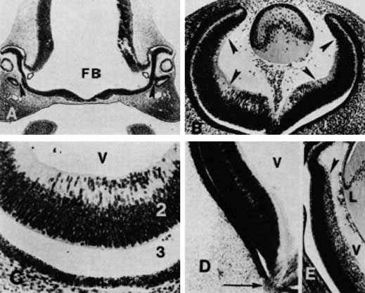 The eyeball starts to develop from neuroectoderm around the twenty-second day of fetal life. A pair of optic primordium, identified as optic pits, form on both sides of the midline in the ventrolateral region of the primitive forebrain. At approximately the 3-mm stage of development, the optic pits extend outward as hollow spheres ventrolaterally from the neural tube to form the optic vesicles.29,30 They become separated from the forebrain by a constriction, or stalk. The cavity of the future third ventricle is continuous with the cavity of the optic stalk and vesicles (Fig. 17A). The next event is the invagination of the optic vesicles, by differential growth and buckling, to form the optic cup. This occurs around the fourth week of fetal life. The optic cup forms a fold inferiorly and ventrally to form the “embryonic fissure” through which the mesenchymal and vascular tissues enter the globe (see Fig. 17A). The embryonic fissure begins to close midway in the fissure and extends anteriorly and posteriorly. The process is completed by the end of the seventh week of gestation. Incomplete closure of the fissure can result in colobomas of the iris, retina, or choroid.31 The retina develops from the neuroectoderm following the formation of the optic cup. The inner layer of the optic cup develops into the retina, and the outer layer develops into the retinal pigment epithelium. The differentiation of multipotent stem cells of the single-layer optic vesicle ectoderm into the multicellular mature retina is an ordered event that follows discrete stages. Recent studies indicate that cell fate determination in the vertebrate retina depend on changes in the response of the mitotic cells within the retina as well as changes in environment around these cells.32 The first stage is the differentiation of the cells of the optic vesicle into a two-layered tissue, the “neuroepithelium.” This stage of development commences simultaneously with the formation of the optic cup. During this process, a layer of ependymal cells that show numerous mitoses appears at the edge of the vesicle. At the base of these cells is a basement membrane from which extend numerous fine cilia.29 Interdigitation of the cilia with the cells of the outer layer of the optic vesicle is a precursor to the subsequent arrangement of the insertion of the photoreceptor outer segments into the spaces between the microvilli of the pigmented epithelium. Immediately internal to the ependymal layer is the thick layer of primitive undifferentiated cells, which are characterized by cytologic evidence of high mitotic and metabolic activity—large oval nuclei with darkly staining nucleoli and a prominent chromatin net. The ependymal layer and the aggregation of the nuclei of the undifferentiated cells form the “primitive zone,” constituting the outer 90% of the neuroepithelial thickness. The inner 10% is made up of the “marginal zone,” which consists of the cytoplasmic extensions of the multitudinous outer primitive cells. The marginal layer is microscopically differentiated by its lack of nuclei until the 10-mm stage at 6 weeks of development. At the beginning of the invagination of the optic vesicle, the distal end of the primitive ophthalmic artery grows into the embryonic fissure from below. When the fissure closes, the artery becomes trapped within the cavity separating the marginal zone from the lens vesicle. Intraocular branches of this transitory hyaloid artery (Fig. 17B) presumably meet the nutrient requirements of the developing retina until its own vasculature is established during the fourth month of gestation. From the sixth week to the third month, the neuroepithelium gradually develops into the neuroblastic layers, from which the mature retina subsequently develops. The pattern of this change resembles the morphogenesis of the central nervous system, with the spread of cellular proliferation directed from the inner layer toward the outer layers. Because of its invagination, the neuroepithelium's direction of proliferation is translated into progression from the outer toward the inner layers (Fig. 17C). The primitive cells internal to the ependymal layer divide and migrate inward to form a distinct new layer of nuclei where the marginal layer had been (see Figs. 17B and 17C). This results in the formation of the inner and outer neuroblastic layers, which are separated by the transient nerve fiber layer of Chievitz (see Figs. 17B and 17D). This distinct, three-layered structure is temporary. It gradually takes on the more complex architecture of the retina by cellular differentiation. This differentiation of the neuroblastic layers progresses from the inner layer (future ganglion layer) to the outer layer (future photoreceptor layer) such that the outer retina takes on its mature appearance last.33 In addition, this differentiation of the neuroblastic layers is more precocious in the posterior pole as compared with the periphery (see Figs. 17B and 17E), and the development of the supportive structures occurs earlier than that of the neural structures. Exemplifying these developmental principles is the finding that the Müller cells, which are the primary supportive elements of the retina, are the first of the retinal cells to appear, and they are found at the posterior pole as early as the 10-mm stage. The original position of the Müller cells is adjacent to the internal limiting membrane, which they contact with their inner processes. This results in a double-layered internal limiting membrane whose inner component is the basement membrane formed by the original neuroectodermal cells, and the outer layer is the pseudomembrane formed by the adhesion of the terminal processes of the Müller cells. The Müller cells elongate to extend through the full thickness of the retina until they insert onto the outer basement membrane, which was previously formed by the neuroectodermal cells. The external limiting membrane forms 