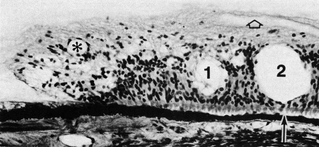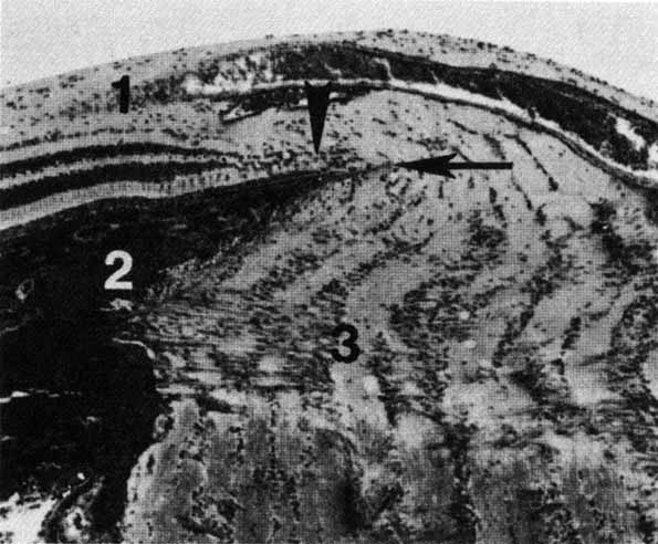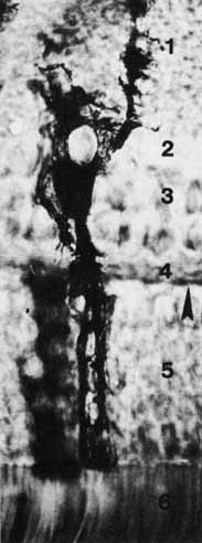 Beyond the area centralis, the retina spreads out smoothly over the vortex veins, which are visible through the retina and underlying pigment epithelium during ophthalmoscopy. This equatorial region lays approximately 15 mm posterior to the corneoscleral junction and approximately 3 mm posterior to the geometric equator in the emmetropic globe. At the equator, the retina has a vertical diameter of 24.08 ± 0.94 mm and a horizontal diameter of 24.06 ± 0.60 mm. Measured as a cord, the distance from the corresponding margin of the optic disc to the equator is 14.71 ± 1.08 mm in the superior meridian, 14.51 ± 1.01 mm inferiorly, 13.27 ± 1.11 mm nasally, and 17.29 ± 1.60 mm temporally. This diameter provides a theoretic estimate of the retinal area as 1206 mm2 (estimating the retinal surface to cover two thirds of a sphere of this dimension). Changes in tissue size and shape during preparation have precluded the estimation of the actual retinal area. Anteriorly, the retina can be seen to terminate in an irregularly wavy edge, the ora serrata. Measured as a cord from the equator, this lies 6 ± 1.22 mm temporally, 5.8 ± 1.12 mm nasally, 5.07 ± 1.11 mm superiorly, and 4.79 ± 1.22 mm inferiorly. Using 1.50 mm as the estimation of a disc diameter (dd), the distance from the equator to the ora is approximately 3 dd. The distance from the anterior limit of the retina to Schwalbe's line is 6.14 ± 0.85 mm superiorly, 6.20 ± 0.76 mm inferiorly, 5.73 ± 0.81 mm nasally, and 6.52 ± 0.75 mm temporally.4 This places the ora approximately at the point of the rectus muscle insertions around the globe. A recent study of the relationship between the ora serrata and the spiral of Tillaux in cadaver eyes showed that in 68% the midpoint insertion of all rectus muscles was within 1 mm of the ora serrata.5 In addition, in most cases, the lateral rectus muscle most consistently inserted closest to the ora. This anatomic fact is important in vitrectomy surgery. The surgeon can place the sclerostomies for pars plana vitrectomy as far back as 4 mm posterior to the limbus and still have access to the ora serrata extending circumferentially from the meridian of the sclerostomy.6 The 95% tolerance interval for the location of the ora serrata is 4.21 mm posterior to the surgical limbus superiorly and at least 4.81 mm posterior to the limbus temporally.5 The termination at the ora is marked by retinal extensions, labeled teeth, which protrude into the ciliary epithelium. The teeth are more prominent in hyperopic than in myopic eyes, and they have an uneven but characteristic distribution around the ora. Separating the teeth are ora bays, which are indentations of the ciliary epithelium onto the retina. The vitreous base is attached to the retina at the ora from approximately 1.8 mm temporally to 3 mm nasally, posterior to the ora bays.7 The anterior insertion of the vitreous base into the ciliary epithelium is 1 or 2 mm anterior to the ora. The posterior margin of the vitreous base has a relatively smooth contour in normal young eyes, whereas the anterior margin follows the serrations. With aging, the posterior margin of the insertion becomes irregular and migrates posteriorly such that it is close to the equator.8 These changes are thought to play a role in the pathogenesis of retinal breaks from peripheral retinal traction.9 A cross section of a low-power histologic preparation of the retina in the region immediately peripheral to the area centralis shows it to have nine layers (Fig. 3). From internally (the side toward the vitreous), the layers are as follows: The internal limiting membrane Based on histologic studies, the retina is thickest at the foveal margin (0.23 mm) and tapers to approximately 0.10 mm at the foveal center (umbo) and 0.18 mm at the equator. It gradually thins further to 0.11 mm in thickness at the ora serrata (Fig. 4A) as the density of all the neuronal elements, including photoreceptors and ganglion cells, decreases peripherally.3 With use of noninvasive techniques in normal live human subjects, the mean thickness of the foveal center is estimated to be 0.18 mm using the retinal thickness analyzer and 0.15mm with optical coherence tomography (Fig. 4B).10 Among patients with clinically diagnosed macula edema, the mean foveal thickness increases to 0.40 mm using the retinal thickness analyzer and 0.32 mm with optical coherence tomography. The distinct layering pattern of the retina reflects the arrangement of neural, glial, and vascular cells that enables the retina to convert and process photic energy into neuronal electrical signals that ultimately reach the occipital visual cortex of the brain. This entire pathway consists of the photoreceptor cell and three neurons.11 The photoreceptor cells (rods and cones) are located in the outermost layer of the retina. The outer segments of the rods and cones initially convert the light signal to electrical energy. The outer nuclear layer contains the cell bodies with nuclei of the photoreceptor cells. In the outer plexiform layer, axons of the photoreceptor cells synapse with the dendrites of the first neuron (the bipolar cell) and with the processes of the integrating neuronal cells, the horizontal cells. The bipolar cells, whose nuclei form the bulk of the inner nuclear layer, synapse in the inner plexiform layer with the dendrites of the second neurons, the ganglion cells. In this layer there are also synapses with amacrine cells, which resemble horizontal cells in that they provide cross wiring within the retinal layer. The ganglion cells extend their axons as the innermost retinal layer, the nerve fiber layer, through the optic nerve to the lateral geniculate body, where they synapse with the third neuron, the cells of the lateral geniculate body, which extend their axons through the optic radiations to the occipital cortex (Fig. 5). |