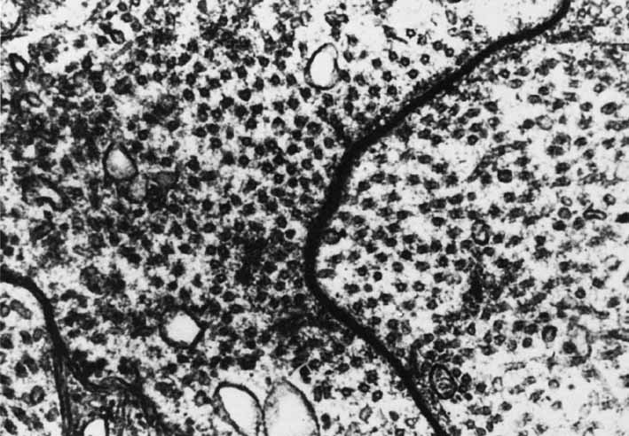 The basic feature of the presynaptic elements of the chemical synapse is the boutons terminaux at the ends of the axons, or boutons en passant along their length.45 In the central nervous system, these occur at points where myelination has ceased. The lack of myelination in the retina makes it impossible to use myelination gaps for synapse identification. Although most synapses are axodendritic, axosomatic, or axoaxonal, other types have been documented in the brain and the retina where the presynaptic component is not axonal but dendritic or somatic. However, all of these synaptic types share a common morphology consisting of presynaptic and postsynaptic membranes, the densities associated with their cytoplasmic faces, and the synaptic cleft between them. In the retina, three different classes of chemical synapses have been described based on the appearance of the presynaptic element: conventional synapse, ribbon synapse, and flat or basal junction.66 The conventional synapse, which is similar in morphology to other chemical synapses found throughout the vertebrate nervous system, has aggregates of synaptic vesicles clustered close to the presynaptic membrane. These vesicles are membrane-bound organelles that contain neurotransmitter substances and enzymes involved in neurotransmitter metabolism.67 They lie in the midst of a hexagonal array of electron-dense particles, each 30- to 50-nm wide and separated from neighboring particles by an interval of 20 to 50 nm.68 This electron-dense material is believed to play a role in the attachment of the synaptic vesicles to the presynaptic membrane. These synapses are found in the presynaptic terminals of horizontal cells, amacrine cells, and interplexiform cells.66 They typically have an inhibitory effect in the postsynaptic neuron. The ribbon or invaginating synapse, in contrast, is usually found in the presynaptic terminals of photoreceptors and bipolar cells in the retina (Fig. 20). They are also often observed throughout the invertebrate nervous system. The presynaptic terminal of the ribbon synapse is characterized by the presence of an electron-dense bar or a ribbon of approximately 1 um length that is oriented perpendicular to the presynaptic membrane. Reconstruction reveals that this ribbon is in fact a rectangular or horseshoe shaped plate composed of two osmiophilic electron-dense lamellae flanking an electron-dense central layer69,70 This synaptic ribbon is surrounded by a precisely arranged array of synaptic vesicles and appears to be anchored to the presynaptic membrane by three to five delicate electron-dense filaments. The shape and size of the synaptic ribbons can change depending on the maturation stage, activity state of the synapse, or light/dark cycle. Although the precise function of the synaptic ribbon is unknown, it has been hypothesized to function as a “conveyor belt” to channel synaptic vesicles to the presynaptic membrane for neurotransmitter release, to immobilize the vesicles in inactive synapses, storage device for synaptic transmitter, and to act as a diffusion barrier for presynaptic ions.69 In the inner plexiform layer, this synapse has two postsynaptic processes, forming a “dyad.” In the outer plexiform layer, there are three postsynaptic processes, forming a “triad” (see Fig. 20). Basal junctions are found in the presynaptic terminal of photoreceptors only.66 In the mammalian retina, these junctions are found only in association with cone cells. Typically, the presynaptic membrane is smoothly indented, and there is prominent electron-dense material on the inner surface of the terminal membrane. However, no synaptic vesicle is seen in association with the electron-dense material. The exact mechanism for chemical transmission through these synapses is unclear. However, in axonal terminals of goldfish horizontal cells in which no presynaptic vesicles are found, neurotransmitter release is believed to occur by a carrier-mediated mechanism.71 Such a process may be involved in basal junctions of mammalian photoreceptors. The involvement of a neurotransmitter in signal transduction is implicated by freeze-fracture studies that show that the postsynaptic membranes of these synapses contain particles that are similar to those found in the postsynaptic membranes of these synapses contain particles that are similar to those found in the postsynaptic membranes of a conventional synapse in the brain. The synaptic cleft of a typical chemical synapse is 20- to 30-nm wide.45 It is not a free space because it houses material that binds the presynaptic and postsynaptic membranes together in a strong adhesion. The electron-dense plaque in the middle of the synaptic space contains mucopolysaccharides and proteins, which may serve to maintain the attachment between the presynaptic and postsynaptic membranes through a form of polyionic binding. Filaments composed of macromolecules span the synaptic cleft. This synaptic cleft substance may be important for formation, localization, and proper function of the synapse. Macromolecules spanning the gap between the presynaptic and postsynaptic membranes may ensure rapid transport of the transmitter molecule through the cleft and may prevent the transmitter from diffusing away from the synapse.72 In the postsynaptic membrane, a linear density is present. From this structure, filaments project out toward the cytoplasm.45 These densities form either a single large or several small discs, which may be interspersed with puncta adhaerentia. The anatomic location of the receptors for the transmitter molecule in the postsynaptic membrane has not yet been determined. However, freeze-fracture studies have shown minute bumps within the specialized zone of the postsynaptic membrane that may represent the neurotransmitter receptor molecule.66 In the case of the neuromuscular junction, alpha-bungarotoxins that bind to the acetylcholine receptor have been localized in the regions of the posts