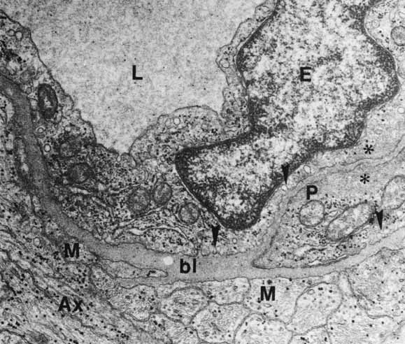The termination of the capillary beds at the border of each of these avascular areas follows a common pattern. At the edge of the capillary-free zone at the fovea, long capillaries link the terminal arterioles and venules to form a delicate circular web of concentrically arranged channels whose width decreases as they approach the edge of this arcade. There are no direct shunts between the arterioles and venules in this or any other terminal area of the retinal circulation. The only normal connection between the inflow and outflow systems is through the capillaries. At the retinal periphery, the capillary bed terminates in an arcade between the arterial and venous system. The major distinction of this region is that the capillaries are more widely separated from each other and are of wider caliber than at the perifoveal arcade. But here, too, there are no shunts between arterioles and venules in the normal eye, and there is a capillary arcade facing the avascular space that surrounds both the arteries and veins. Recent advent of scanning laser Doppler flowmetry has made it possible for retinal blood flow to be quantitated clinically. Volume of blood flow in the nasal retina was significantly lower than that for the temporal retina as a result of smaller retinal vessels and slower blood flow velocity in the nasal retina.249 This was consistent with the higher metabolic demand expected of the temporal retina from its larger size and the presence of the metabolically active fovea. The blood flow through the fovea itself was low because of the presence of the foveal avascular zone.250 The capillary meshwork spreads from the ganglion cell layer through the inner nuclear layer. There are no vessels in the outer plexiform and outer nuclear layers (see Figs. 3 and 47). The exact pattern of distribution of the capillaries in the retina was controversial because of conflicting earlier reported results. With trypsin digest studies, a diffuse arrangement was suggested (see Fig. 48).251,252 In contrast, whole-mount preparations demonstrated that the capillary bed is divided into two distinct laminae throughout most of the posterior retina (Fig. 49).253,254 According to this bilevel schema, the deep capillaries lie in the inner nuclear layer and form a more closely set meshwork than do the superficial capillaries that occupy the nerve fiber and ganglion cell layers. The outer meshwork appears to consist of fine-caliber vessels ranging from 15 to 130 μm in diameter. The superficial capillaries have a slightly wider caliber, ranging from 16 to 150 μm in diameter. The volume of the deep capillary network is relatively constant at different locations of the posterior retina. In contrast, the volume of the superficial capillary network varies dramatically and parallels the thickness of the nerve fiber layer rather than the total retinal thickness.255,256 Thus, in the peripapillary retina the vascularity is the greatest, and up to four different capillary layers are identifiable, even though the retinal thickness is comparable to that of the parafoveal crest (Fig. 50). In contrast, in the perifoveal region and at the ora serrata, the capillary network thins to a single layer. In the peripapillary region, this unique lamina of capillaries in the superficial portion of the nerve fiber layer originates from intraretinal precapillary arterioles and drains into retinal venules and veins lying on the optic nerve head.257 These capillaries have a long straight or slightly curved path fanning out over the nerve fiber layer within two disc diameters of the papilla and are the most prominent in the superior and inferior temporal quadrants of the peripapillary zone. This peripapillary radial capillary bed is unique among retinal capillaries in its lack of anastomoses with other capillaries, infrequent arterial input, and unusually great length (over 100 μm). These features make these capillaries especially vulnerable to the effects of elevated intraocular pressure and changes in retinal perfusion. This anatomic distinction has been invoked to explain the arcuate scotoma in glaucoma, peripapillary flame-shaped hemorrhages associated with hypertension and papilledema, and superficial cotton wool spots associated with retinal ischemia.258,259 The capillary wall is the simplest of the walls of the retinal vessels. It consists of endothelial cells, intramural pericytes (Figs. 51 and 52), and basement membrane. The endothelial cells are so attenuated that their nuclei bulge into the lumen of the capillary. Because the diameter of the lumen of capillaries is small, ranging from 3.5 to 6 μm, the nuclear protrusion causes sufficient distortion that circulating erythrocytes must mold themselves to the luminal contour to pass. The endothelial cells form tight junctions with each other, preventing metabolites from passing freely through the vessel wall. The tight junctions are continuous and are the anatomic basis for the blood–retinal barrier.239 Pinocytic vesicles have been visualized with electron microscopy (see Figs. 51 and 52) and provide the only known significant means for metabolic transfer between the circulation and the retina. Diseases involving the endothelial cells disrupt this normal physiologic barrier and result in exudation of protein and lipid into the surrounding retinal tissue. This breakdown in the blood–retinal barrier is often transient because the endothelial cells can undergo mitosis in response to injury and can form new tight junctions.28 The intramural pericytes reside within the basement membrane of the capillary endothelium (see Fig. 51). They can be seen in cross sections examined by electron microscopy or in stained mounts of trypsin digest examined by light microscopy.260 The nuclei of the intramural pericytes are darker and more spherical than those of the endothelial cells. They bulge externally toward the surrounding glia. The cell contour, shown by special staining or by retinal diges