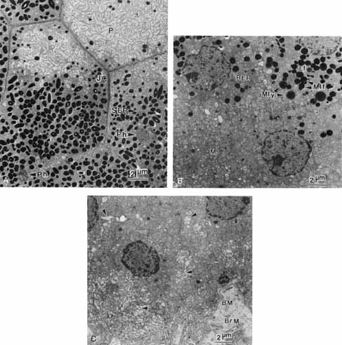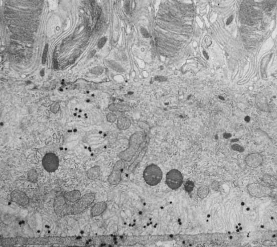 A hallmark of epithelial cells is the location at their basal surface of a supporting structure composed of organized extracellular matrix called a basement membrane, whose molecular constituents include collagen, laminin, entactin, and heparan sulfate proteoglycan15,35 (Figs. 3, 5, and 6). The RPE is indeed separated from the underlying choriocapillaris by a thick extracellular matrix called Bruch's membrane, although the latter is more complex than a simple basement membrane. Bruch's membrane contains five distinct layers, of which the outermost is the true basement membrane of the RPE cells.43 Adhesion between the basal surface of the RPE and its basement membrane is stronger than that between the apical membrane and the outer segments of the photoreceptors, hence the resultant detachments that preferentially occur at the RPE/NR interface after traumatic injury. The molecular basis of RPE adhesion to its underlying matrix has been the subject of investigation indicating that cell-matrix adhesion proteins called integrins mediate this process both in vitro44 and on Bruch's membrane.45 Integrins are heterodimeric transmembrane proteins that form a bridge linking vinculin, talin and fodrin and other components to the actin cytoskeleton intracellularly, and to matrix proteins such as collagen, laminin, and fibronectin outside the cell.35 Together, these components form junctional structures called focal adhesions that are visible at the basal surface of RPE cells35,46 (Figs. 9 and 11). The adhesive interactions between the RPE and the underlying connective tissue constitute a major conduit for regulation of cell function and maintenance of phenotype.18,19 Similar to the outermost layer, the innermost layer of Bruch's membrane is also a true basement membrane, in this case associated with the endothelial cells of the choriocapillaris. Between these layers is a tripartite structure composed of a central layer rich in elastic fibers, surrounded on either side by a thick collagenous layer. It is within the outer collagenous layer, underneath the RPE basement membrane, where drusen form. Drusen are lipid-rich deposits whose accumulation is associated with the aging process and that may presage AMD. Additional age-related changes in Bruch's membrane have also been described that may deleteriously affect exchange of materials between the choroid and the retina and that thus may lead to retinal malfunction.47 The surface of the basal membrane of RPE cells is characterized by numerous invaginations resulting in a greatly increased surface area that is indicative of active absorption and secretion, and which is involved in regulation of transport and exchange across Bruch's membrane and with the underlying choriocapillaris (Figs. 7 and 12). A variety of channels and receptor molecules for passage and uptake of essential nutrients have been localized here in the basal RPE membrane, including the lactate transport protein MCT333 and a selective chloride channel.30 |