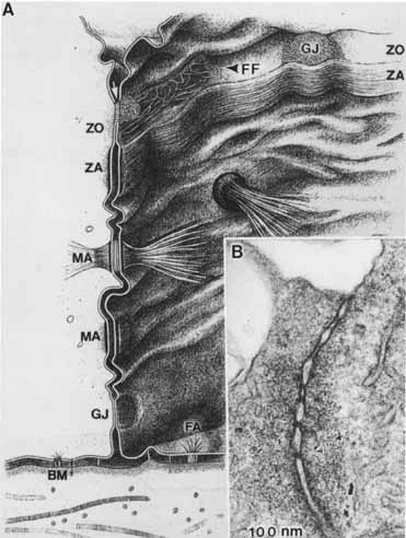 The epithelial integrity of the RPE, as with all epithelial tissues, is critically dependent on lateral cell-cell interactions mediated by a variety of specialized intercellular junctions. The lateral cell membranes of the RPE have relatively flat surfaces, in contrast to the highly convoluted apical and basal surfaces (Figs. 7 and 8). As in typical epithelial cells, the cell-cell junctions of RPE cells form a classical “junctional complex” along the lateral cell membranes, and are arranged in the apical to basal direction as: (1) tight junctions or zonula occludens; (2) adherens junctions or zonula adherens; and (3) desmosomes or macula adherens34,35 (Figs. 4 and 9). However, the latter are not observed as prominently as in many other epithelia, and although desmosomes are observed in human RPE, there is some species-specificity of appearance.36 In addition, a fourth type of cell–cell junction, the gap junction or communicating junction, is also found in RPE cells. While originally classified on the basis of their morphologically distinct electron microscopic appearance, the molecular composition of these cell junctions has now been well characterized. Furthermore, these junctions are recognized to function as more than passive intercellular glues that bind RPE cells together, but in addition they function as loci of bi-directional signaling, integrating the cytoskeleton, intracellular metabolism and gene expression with the extracellular milieu (Figs. 9 and 10).